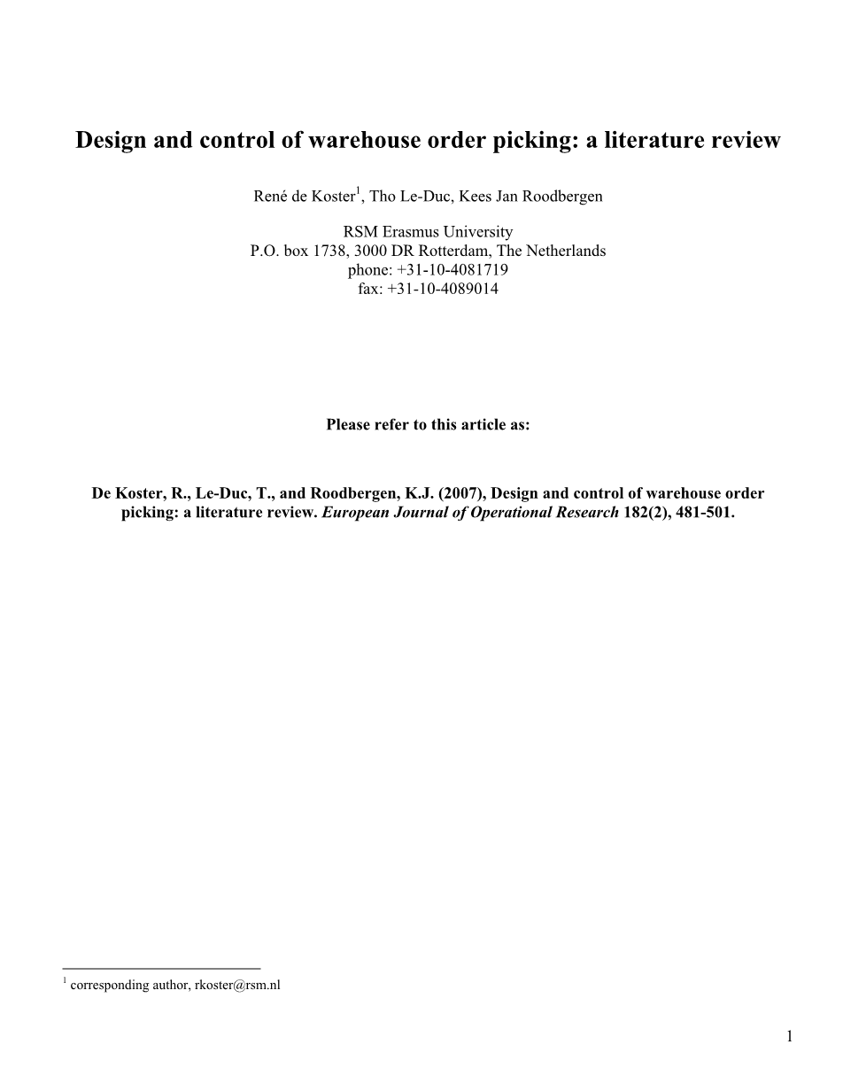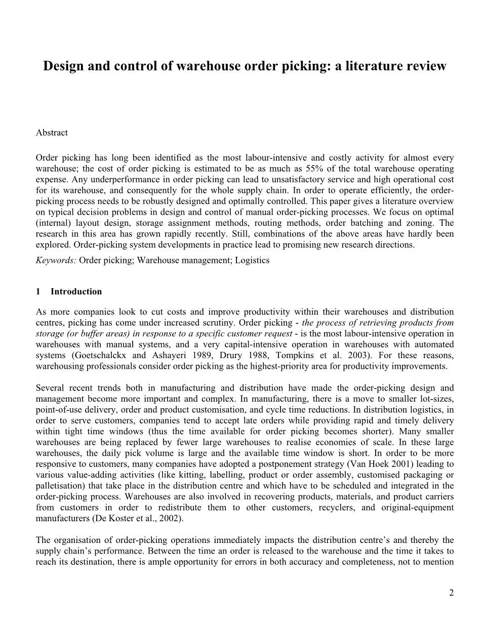 订单拣选长期以来被确定为几乎每个仓库最劳动密集和昂贵的活动;订单拣选的成本估计为仓库总运营费用的55%。订单拣选的表现不佳可能会导致服务不佳,仓库运营成本高,从而导致整个供应链。为了有效运行,订单挑选过程需要得到鲁棒设计和最佳控制。本文给出了手工订单处理设计和控制中典型决策问题的文献综述。我们专注于最优(内部)布局设计,存储分配方法,路由方法,订单批处理和分区。这一领域的研究近来发展很快。然而,上述领域的组合几乎没有被探索。订单采摘系统的实际发展带来了新的研究方向。