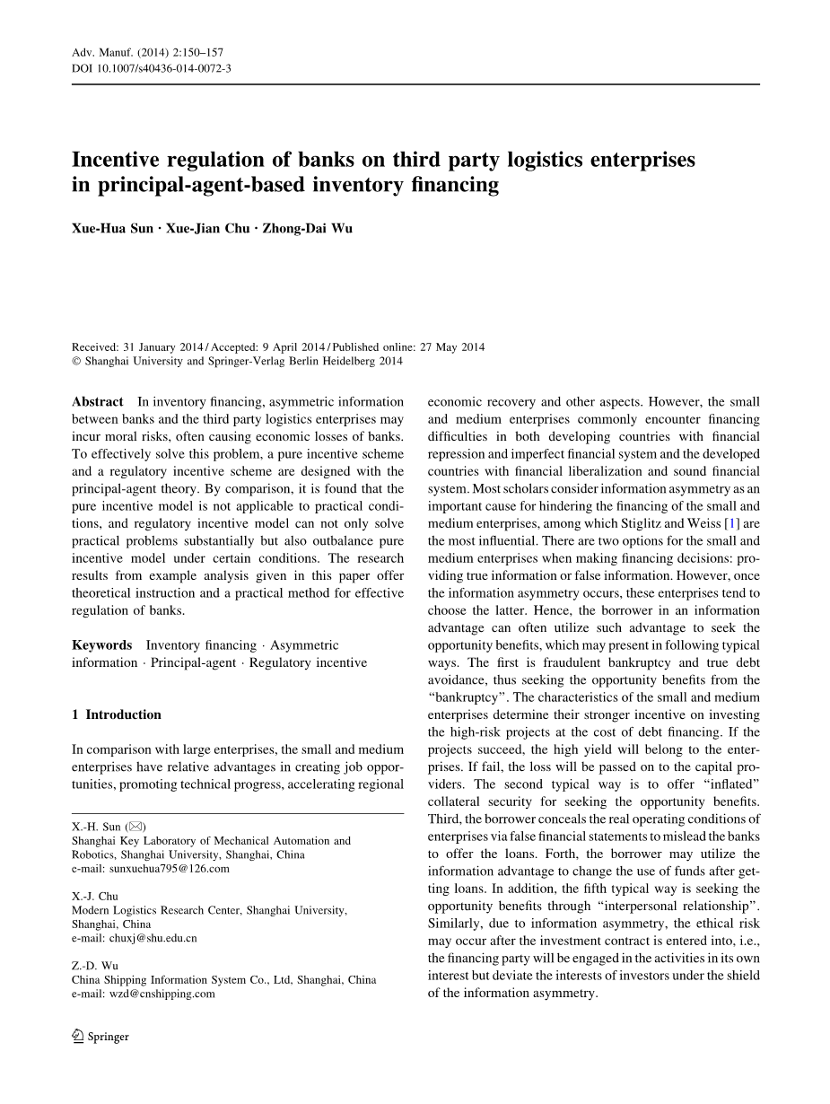 库存融资的摘要,银行和第三方物流企业之间的不对称信息可能招致道德风险,会经常造成银行的经济损失。为了有效的解决这个问题,用委托代理理论设计了一个纯激励计划和一个监管激励计划。通过对比,发现纯激励模型不适用于实际条件,监管激励模型不仅可以基本上解决实际问题,而且在一定条件下可以解决纯激励模型的不平衡问题。本文提供的示例分析的研究结果提供了有效监管银行的理论指导和实用方法。