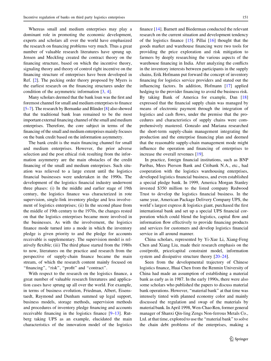 银行信贷是中小企业的主要融资渠道。然而,信息不对称造成的先前逆向选择和后道德风险是中小企业信贷融资的主要障碍。这种情况直到20世纪90年代的物流金融业务开始,才在很大程度上被缓解。物流金融业的发展分三个阶段:第一,在19世纪中期和早期,物流融资的特点是物流监管,单链库存抵押,减少物流企业的参与。第二,在19世纪中期到20世纪70年代中期的第二阶段,物流企业更多地参与到企业中来。与参与相同,物流融资模式转变为优先存货抵押模式,应收账款抵押是补充模式。监管模型是相对灵活的。第三,第三阶段从20世纪80年代开始至今,从供应链金融的角度来看,实践与研究的文献成为主流,其研究内容主要集中在“融资”,“风险”,“ “利润”和“合同”。