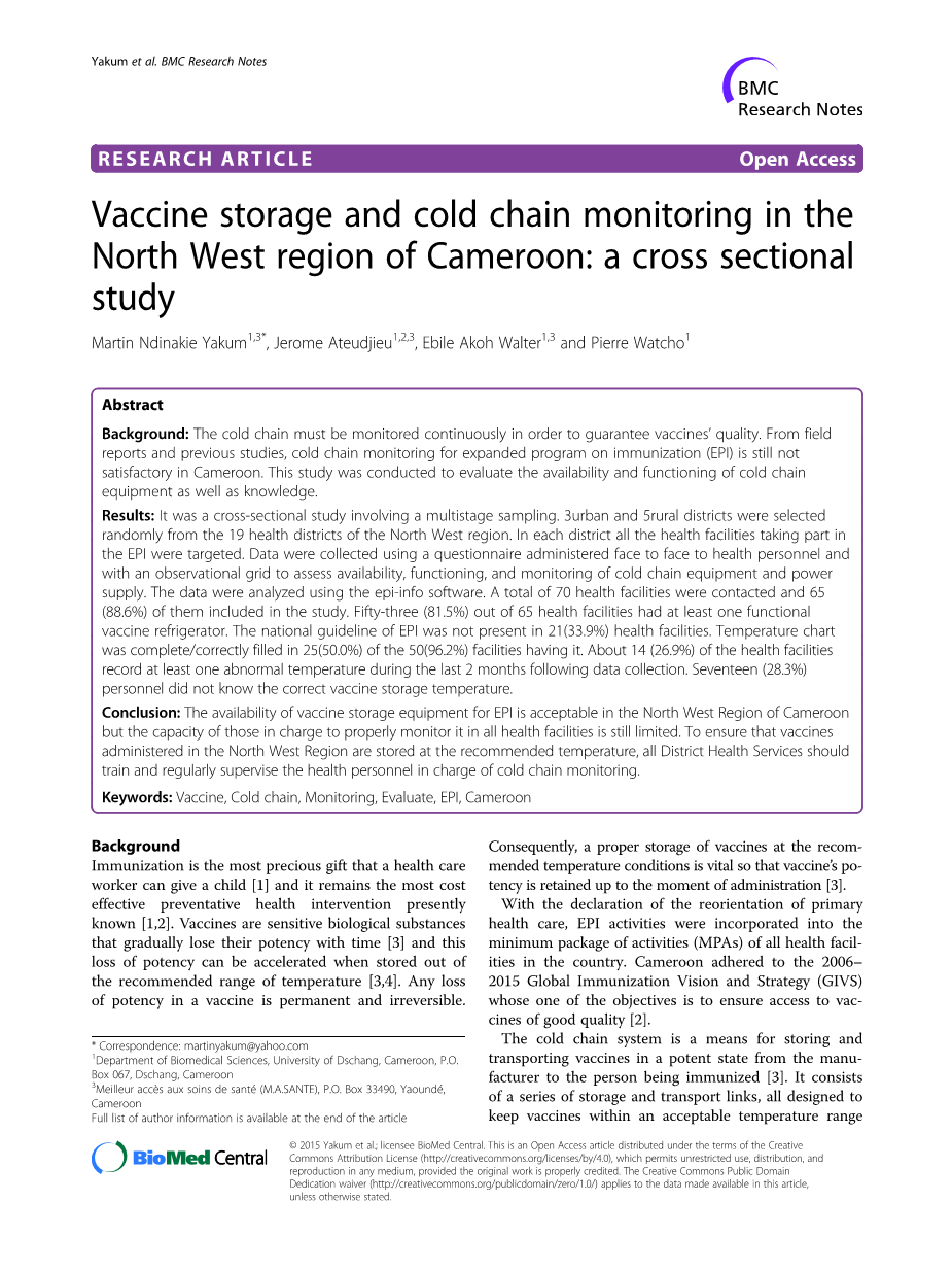 关键词:疫苗、冷链、监测、评估、计划免疫、喀麦隆