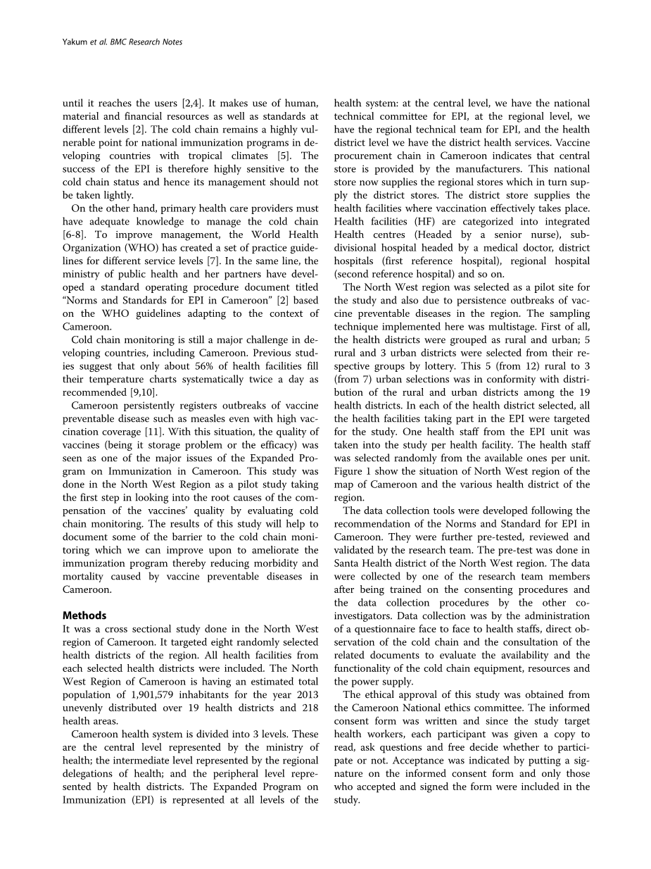 即使疫苗覆盖率很高,喀麦隆仍持续爆发麻疹等疫苗可预防性疾病 [11]。在这种情况下,疫苗的质量(无论是储存问题还是效力)被视为喀麦隆扩大免疫规划的主要问题之一。这项研究是在西北地区进行的,作为一项试点研究,第一步是通过评估冷链监测来研究疫苗质量补偿的根本原因。这项研究的结果将有助于记录一些阻碍冷链监测的问题,我们可以改进这不足,以推动免疫计划,从而降低喀麦隆由疫苗可预防疾病引起的发病率和死亡率。