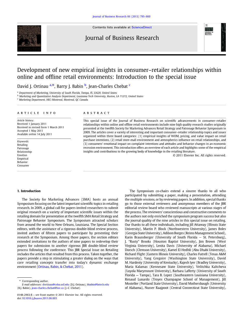 营销进步协会(SMA)每年举办一次研讨会,重点讨论零售业最新的重要科学课题。2009年,全球征集论文邀请研究人员提交关于零售领域各种重要科学问题的原创研究,以便在第十二届零售战略和惠顾行为研讨会上发表。研讨会吸引了来自世界各地的学者来到路易斯安那州的新奥尔良。在严格的双盲审查程序的协助下,特别编辑邀请了十五篇论文的作者参加研讨会,介绍他们的研究成果。在这些论文中,科目编辑向9篇论文的作者发出了邀请,请他们重新编写论文,以便在会后提交给另一个严格的JBR双盲审查程序。本期JBR零售特刊包括此过程所产生的文章。综合起来,这些论文为激发一个更深入的对话提供了台阶,有关核心零售概念如何转移到当今动态的交换环境。(Ortinau, Babin, amp; Chebat, 2011)
