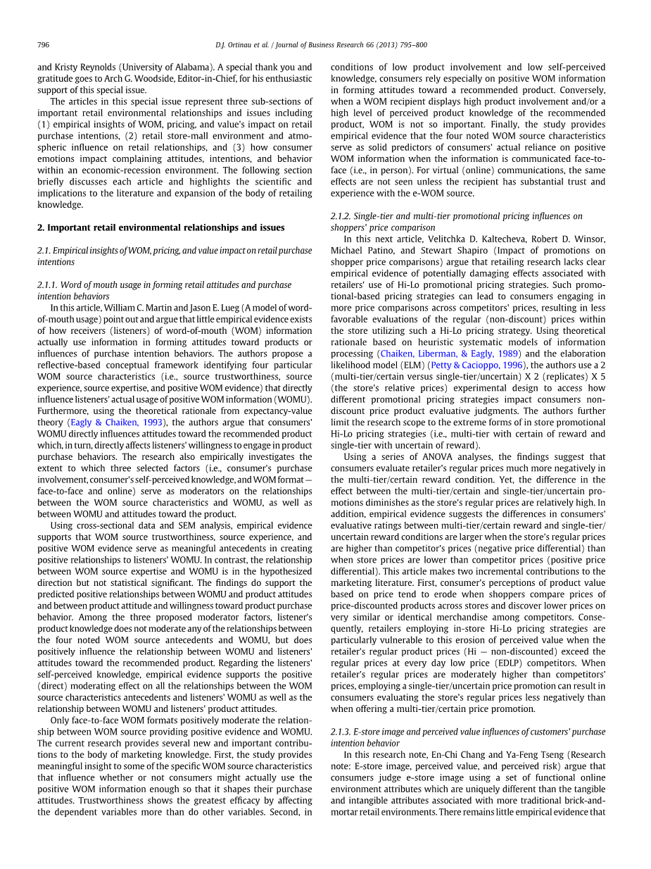 专题讨论会共同主席向所有通过提交文件、作报告、出席多届会议或审查文件而参加的人表示衷心感谢。此外,特别感谢JBR编辑审查委员会的外部评论者和匿名成员,他们在流程的不同阶段审阅了手稿。评论者对作者认真和建设性的评论,不仅使得研讨会项目本身的成功,而且丰富了本期零售特刊九篇文章的期刊质量。我们感谢所有这些人,包括吉尔·阿塔韦(伊利诺伊州立大学)、马丁·布洛克(西北大学)、詹姆斯·博莱斯(佐治亚州立大学)、阿迪尔森·博尔赫斯(兰斯管理学院)、卡琳·布劳恩斯伯格(佛罗里达圣彼得堡南方大学),J.'鲁斯蒂'布鲁克斯(休斯顿浸信会大学),吉姆·布朗(西弗吉尼亚大学),莱尼塔·戴维斯(阿拉巴马大学),迈克尔·多尔施(克莱姆森大学),卡迈勒·埃尔·赫德利(阿布扎比大学),理查德·飞行(东部)伊利诺伊大学)、查尔斯·富特雷尔(得克萨斯州Aamp;M大学)、杨·格雷瓜尔(华盛顿州立大学)、大卫·哈代西(肯塔基大学)、拉杰什·伊耶(布拉德利大学)、玛丽亚·卡拉马斯(肯尼索州立大学)、韦利奇卡·卡尔切娃(肯尼迪大学)洛约拉玛丽蒙特大学),芭芭拉拉弗蒂(南佛罗里达坦帕大学),塔拉B.洛佩兹(东南路易斯安那大学),雷纳德·穆恩多(特洛伊香槟管理学院),吉尔·莫斯特勒(波特兰州立大学),大卫·马瑟斯博(阿拉巴马大学)、努塞尔·拉伊普特(康涅狄格州中部立大学)和克里斯蒂·雷诺兹(阿拉巴马大学)。特别感谢主编阿奇·g·伍德赛德,他热情支持这个特刊。本期特刊中的文章代表了重要零售环境关系和问题的三个子部分,包括(1)口碑、价格和价值对零售商购买意愿的影响的实证研究(2)零售商店环境和气氛对零售关系的影响,以及(3)消费者情绪如何影响经济衰退环境中的抱怨态度、意图和行为。下一章节简要讨论每篇文章,并着重介绍零售知识的科学含义和拓展内容。