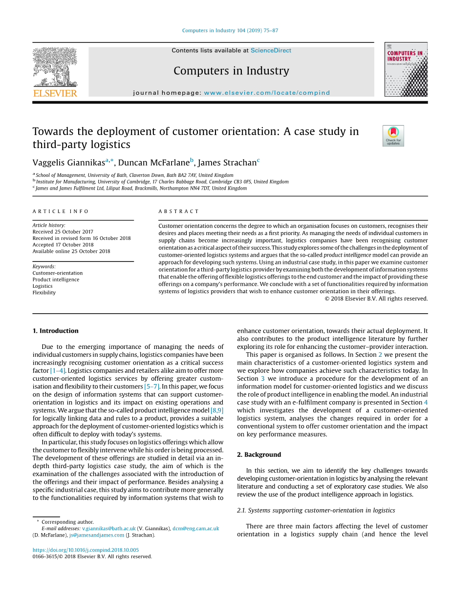 顾客导向关注的是一个组织对顾客的关注程度,认识到他们的需求,并将满足他们需求的场所放在首位。随着管理供应链中单个客户的需求变得越来越重要,物流公司已经认识到,以客户为导向是其成功的关键因素。本研究探讨了以顾客为导向的物流系统部署过程中的一些挑战,并认为所谓的产品智能模型可以为开发此类系统提供一种方法。本文以一个工业案例研究为例,通过这研究为第三方物流供应商提供灵活的物流服务的信息系统,以及提供这些服务对公司绩效的影响,以此来研究第三方物流供应商的客户导向。最后,我们总结了物流供应商的信息系统所需要的一组功能,我们希望这些功能能在其产品中增强客户导向。
