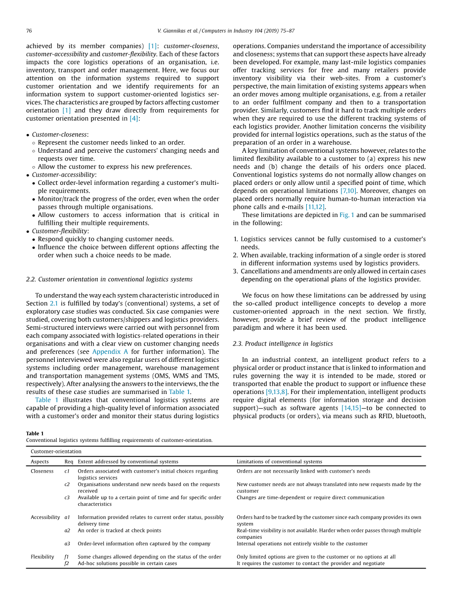 本文组织如下。在第二节中,我们介绍了以客户为导向的物流系统的主要特征,并探讨了当今企业如何实现这些特征。在第3节中,我们介绍了一个面向客户的物流信息模型的开发过程,并讨论了产品智能在启用该模型中的作用。第4节以电子物流公司为例,研究以顾客为导向的物流系统的发展,分析传统物流系统为提供顾客导向所需要的改变,以及对关键绩效指标的影响。