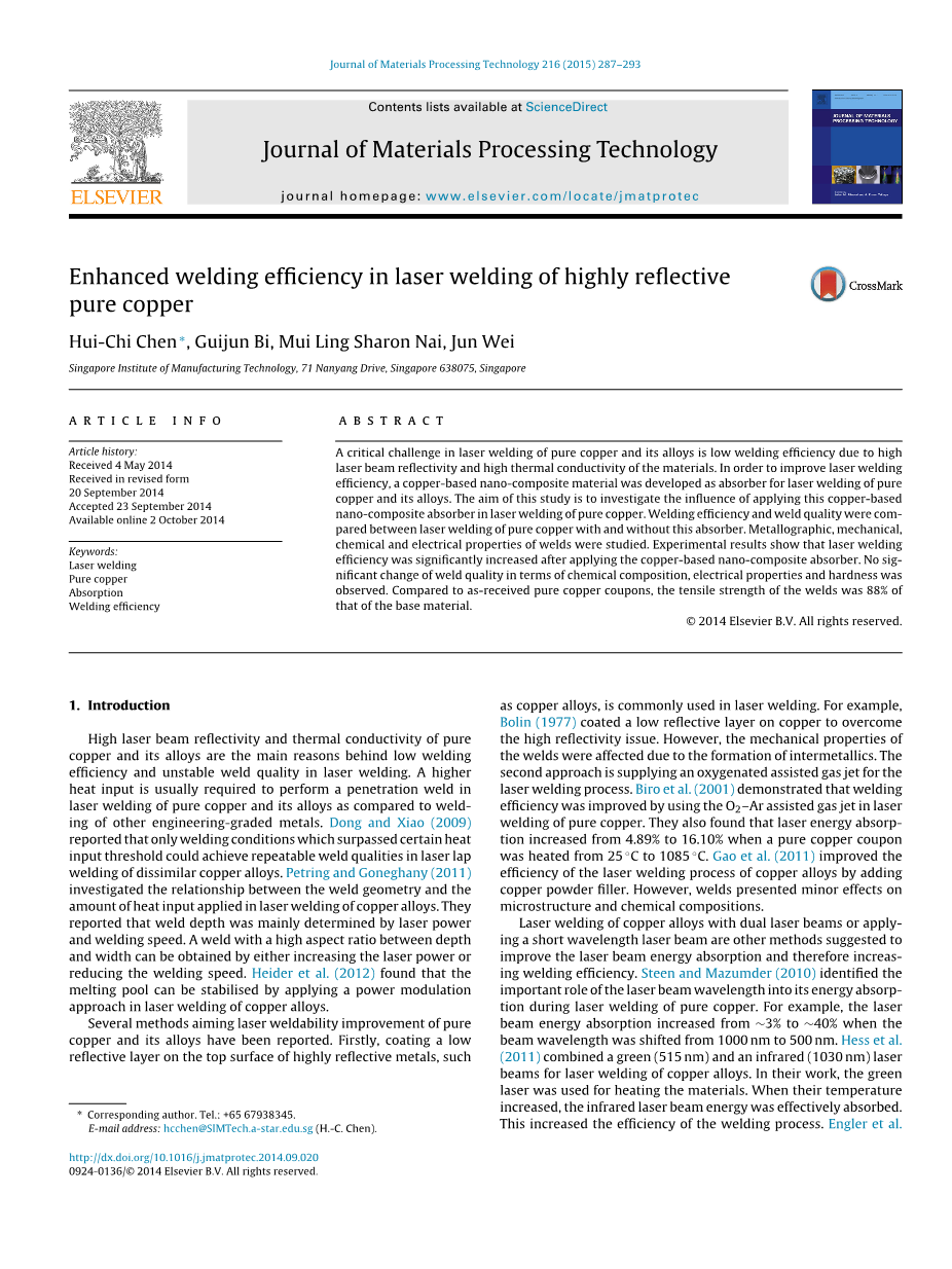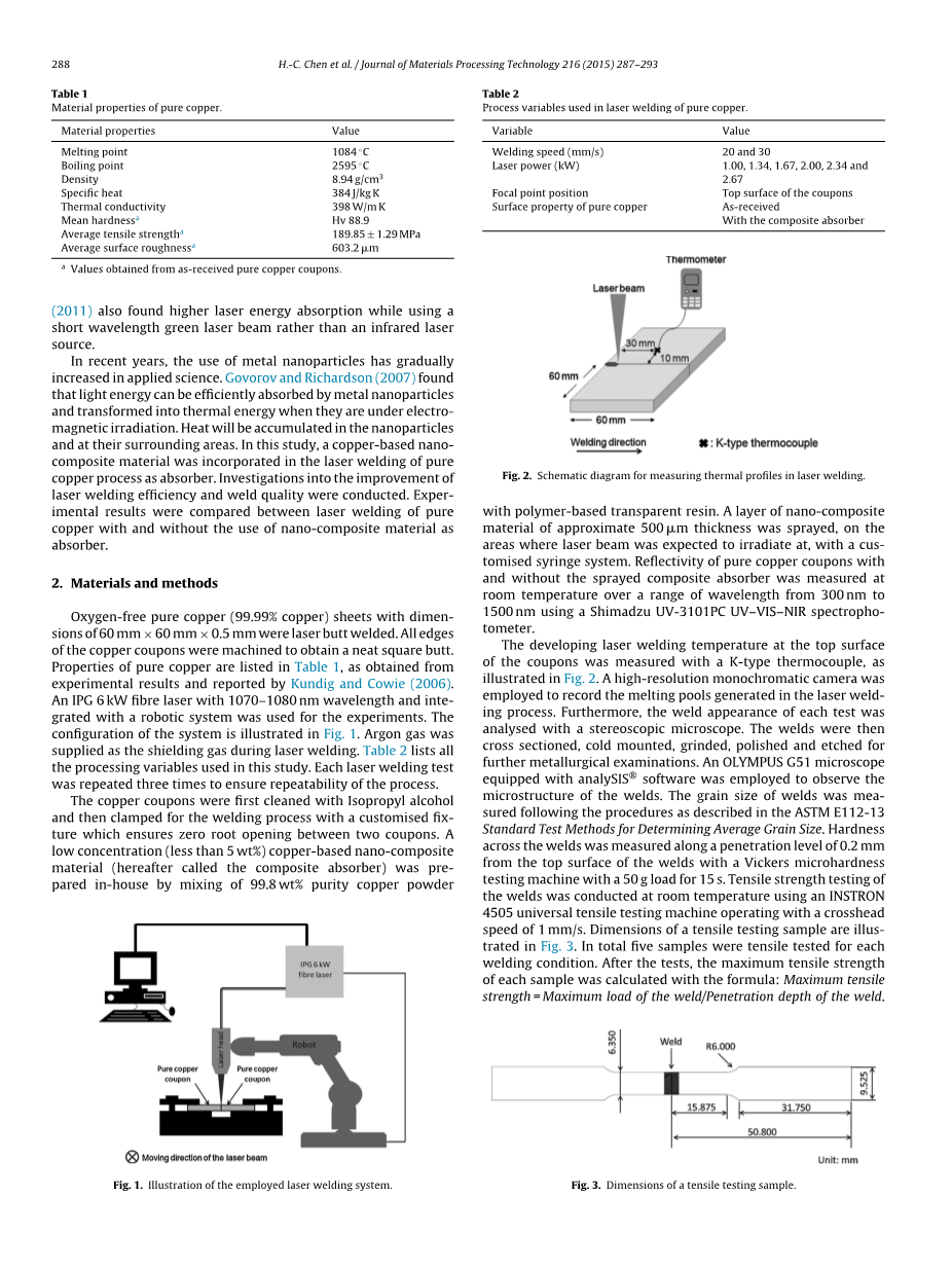 使用双激光束对铜合金进行激光焊接或施加短波长激光束以提高激光束能量吸收并因此提高焊接效率是另外一种方法。 Steen和Mazumder(2010)确定了在纯铜激光焊接过程中,激光束波长对能量吸收的重要作用。例如,当光束波长从1000 nm移到500 nm时,激光束能量吸收从〜3%增加到〜40%。 Hess等人(2011)结合了绿色(515 nm)和红外(1030 nm)激光束,用于铜合金的激光焊接。在他们的工作中,绿色激光用于加热材料。当其温度升高时,红外激光束能量被有效吸收,从而提高了焊接过程的效率。 Engler等人(2011)还发现,在使用短波长绿色激光束而不是红外激光源时,激光能量吸收更高。近年来,金属纳米颗粒的使用在应用科学中逐渐增加。 Govorov和Richardson(2007)发现,光能可以被金属纳米粒子有效吸收,并在电磁辐射下转化为热能。热量将累积在纳米颗粒及其周围区域。在这项研究中,铜基纳米复合材料被纳入了纯铜工艺的激光焊接中作为吸收剂。进行了提高激光焊接效率和焊接质量的研究。比较了在使用和不使用纳米复合材料作为吸收剂的情况下,对纯铜进行激光焊接的实验结果。