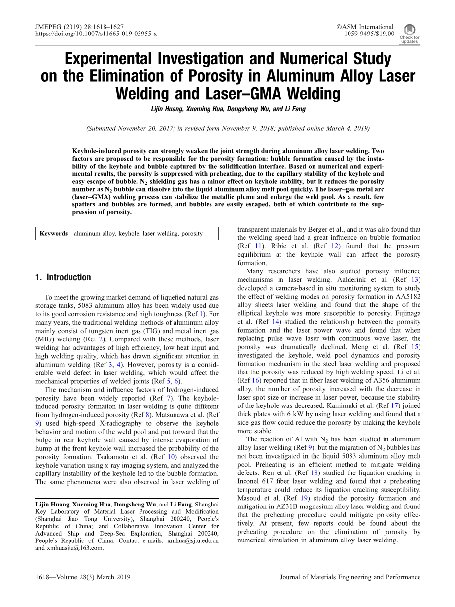铝合金激光焊接和激光-GMA复合焊接中气孔消除的实验研究与数值研究
