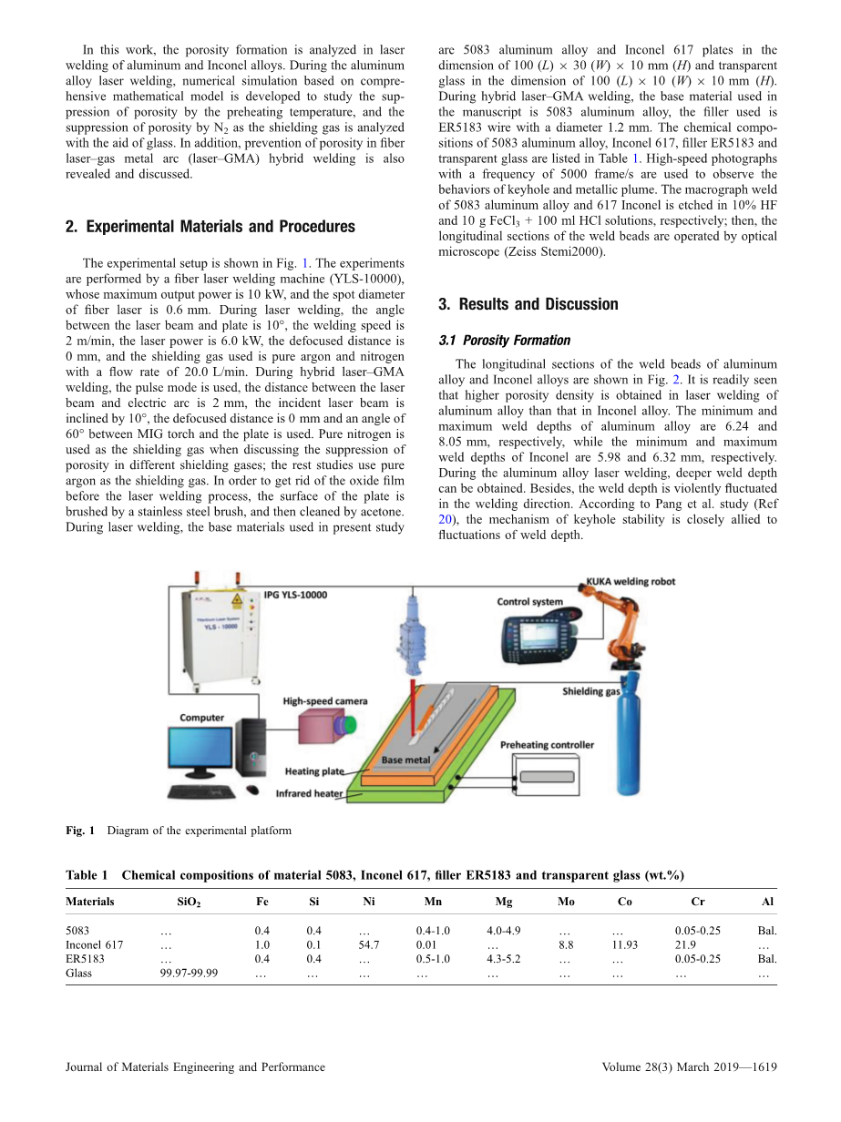 为了满足日益增长的市场对液化天然气储罐的需求,5083铝合金以其良好的耐蚀性和高韧性得到了广泛的应用[1]。多年来,传统的铝合金焊接方法主要由钨极惰性气体(T IG)和金属极惰性气体(MIG)保护焊组成[2]。与这些方法相比,激光焊接具有效率高、热输入低、焊接质量高等优点,在铝焊接中引起了极大的关注[3][4]。然而,气孔在激光焊接中是相当大的焊接缺陷,会影响焊接接头的机械性能[5][6]。