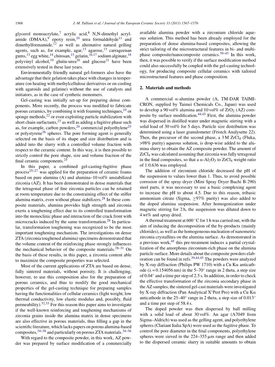对于复合粉末,在本工作中,通过用氯化锆水溶液对市售的氧化铝粉末进行表面改性来制备AZ粉末。这种方法已经用于制备致密的氧化铝基复合材料,允许严格定制双相和多相复合/纳米复合陶瓷的微结构特征。在这项工作中,可以验证表面改性方法是否也可以成功地与凝胶铸造技术相结合,用于生产具有定制的微结构特征和相组成的复合蜂窝陶瓷。