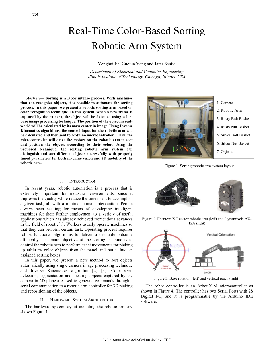 机械臂为他们的进一步就业提供了各种有用的已经取得巨大进展的应用在机器人领域[1]。工人通常操作机器他们可以完成某些任务。操作过程需要提供理想结果的鲁棒函数算法有效地。分拣机的主要目标是控制机械臂执行精确的采摘动作将面板中的任意颜色物体放到分配的分拣框。本文提出了一种新的物体分拣方法。自动使用单摄像机图像处理技术以及反向运动学算法[2][3]。基于颜色检测、分割和定位二维平面中的相机用于通过与机械臂控制器的串行通信,用于3D拾取以及物体的重新定位。