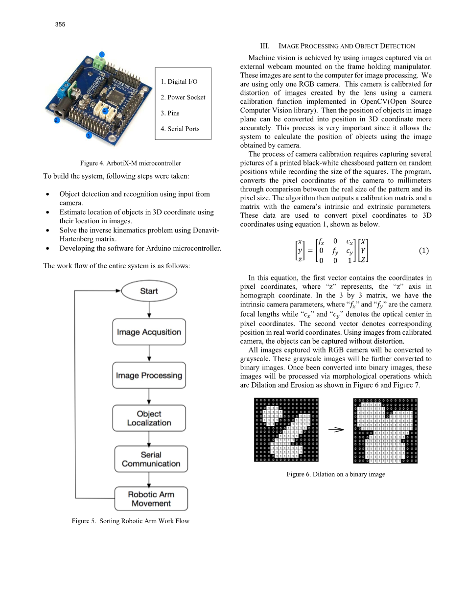 在这个方程中,第一个向量包含像素坐标,其中“Z”表示“Z”轴同形坐标。在3乘3矩阵中,我们有内置摄像头参数,其中“”和“”是摄像头焦距,“”和“”表示中的光学中心像素坐标。第二个向量表示对应的在真实世界坐标中的位置。使用校准后的图像相机,可以不失真地捕捉物体。使用RGB相机拍摄的所有图像都将转换为灰度级。这些灰度图像将进一步转换为二值图像。一旦转换成二进制图像,图像将通过形态学操作进行处理,膨胀和侵蚀如图6和图7所示。