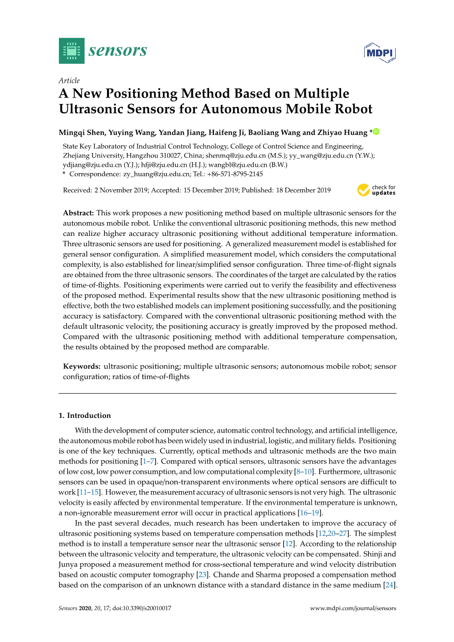 文章介绍了一种基于多超声波传感器的自主移动机器人定位方法——沈明奇、王玉英、江燕丹、海峰集、王宝良、黄志耀 * 国家控制科学与工程学院工业控制技术重点实验室,杭州310027浙江大学,shenmq@zju。中国教育网; yy _ wang@zju。Edu. cn (y.w.) ; ydJiang@zju.中文网(y.j.) ; hfji@zju。网址: edu. cn (h.j.) ; wangbl@zju。中国教育网(b.w.) * 通讯: zy _ Huang@zju。电话。: 86-571-8795-2145收到: 2019年11月2日; 接受: 2019年12月15日; 发布: 2019年12月18日摘要: 这项工作为自主移动机器人提出了一种基于多超声波传感器的新定位方法。与传统的超声定位方法不同,该方法在不增加温度信息的情况下实现了更高精度的超声定位。三个超声波传感器用于定位。建立了一般传感器配置的广义测量模型。针对线性/简化传感器结构,建立了考虑计算复杂性的简化测量模型。
