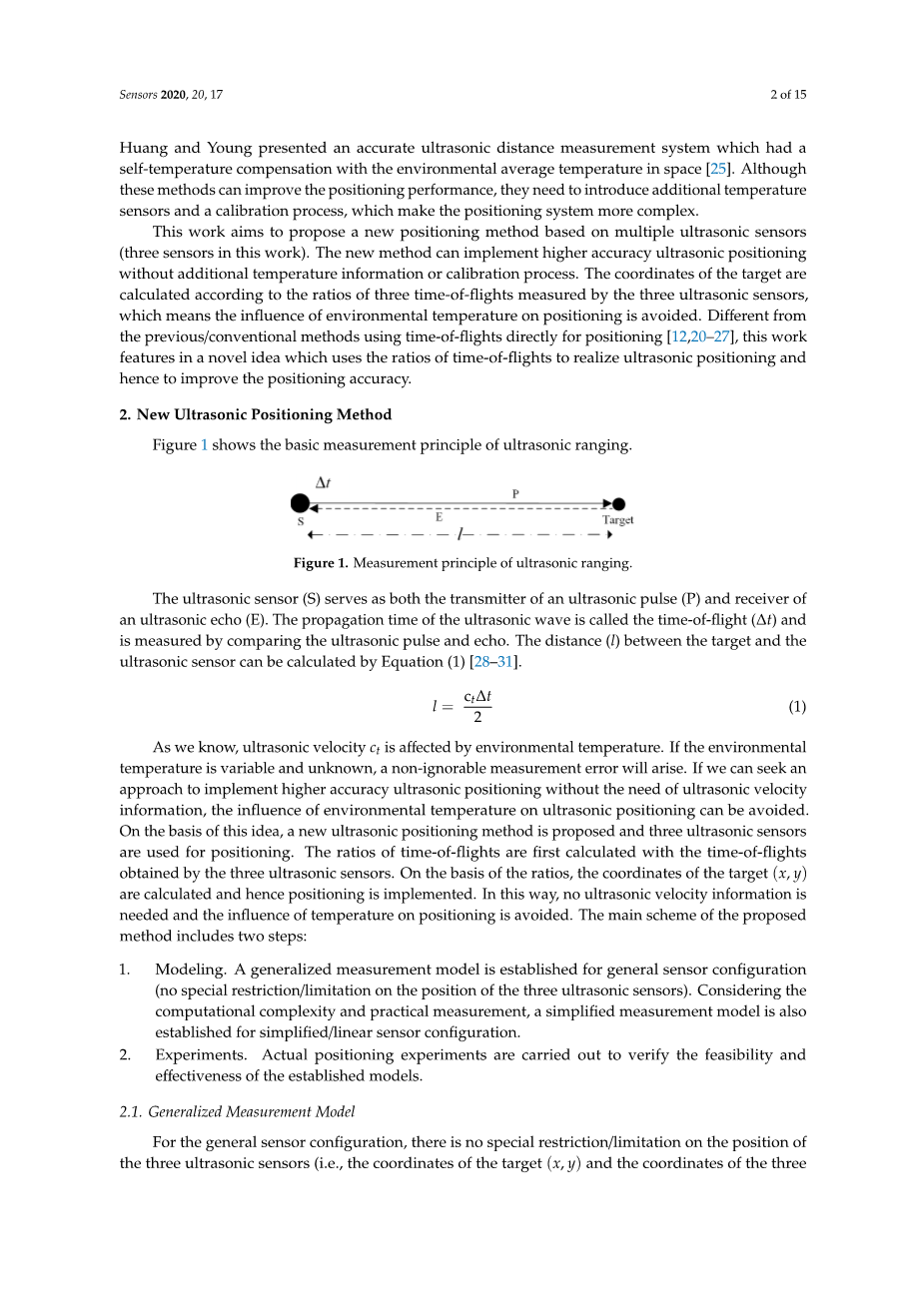 4. 目标与超声波传感器之间的距离(l)可用方程(1)[28-31]计算。正如我们所知,超声波速度受环境温度的影响。如果环境温度变化且未知,则会产生不可忽略的测量误差。在此基础上,提出了一种新的超声定位方法,并采用三个超声波传感器进行定位。首先利用三个超声波传感器获得的飞行时间计算飞行时间比值。在此基础上,计算目标(x,y)的坐标,实现定位。这样就不需要超声波速度信息,避免了温度对定位的影响。该方法主要包括两个步骤1.模特。建立了一般传感器配置的广义测量模型(对三个超声波传感器的位置没有特殊的限制)。考虑到计算的复杂性和实际测量,建立了简化/线性传感器配置的简化测量模型。