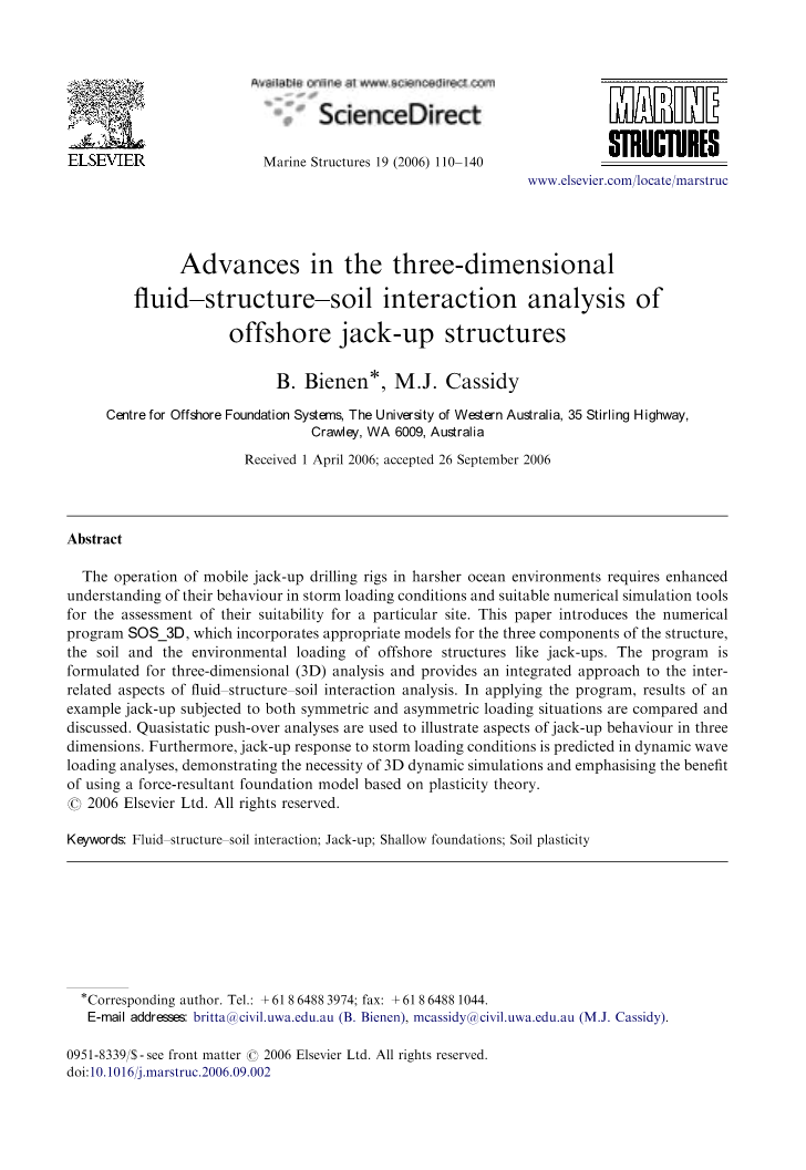 在恶劣的海况下,移动自升式钻井平台的操作运行需要提高他们在风暴载荷条件下的行为方式的理解,并且运用相匹配的数字仿真工具去评定在特殊情况下的稳定性。这篇文章介绍了数字程序SOS-3D,此程序对结合结构的三个部分赋予了适当的模型,例如土壤和自升式海上平台结构的环境载荷。这个程序为了三维分析而编写,并且提供了一个综合的方式对于海流-结构-土壤响应分析的内在响应方面。在应用程序中,对一个自升式平台受对称算法和非对称加载情况的结果事例进行比较进行了讨论。准静态推倒分析被用于描述三维的自升式操作。此外,在动态波加载条件加载分析,在风暴载荷环境下的自升式结构响应被预测,这展示了三维动态仿真的必要性,也强调了基于塑性理论使用合力地基模型的优势。