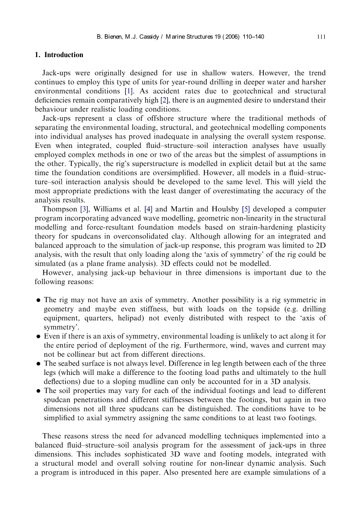 Tomson[3], Williams[4]和Martin和Houlsby [5]开发了一个计算机项目,结合先进的波浪模型,结构几何非线性基于塑性应变强化的建模和力-结果基础模型理论的桩靴粘土。虽然允许一个集成的和平衡的方法模拟的自升式反应,这个程序仅限于2d分析,结果只加载沿对称轴的平台模拟(如平面框架分析)。3d效果无法模仿。