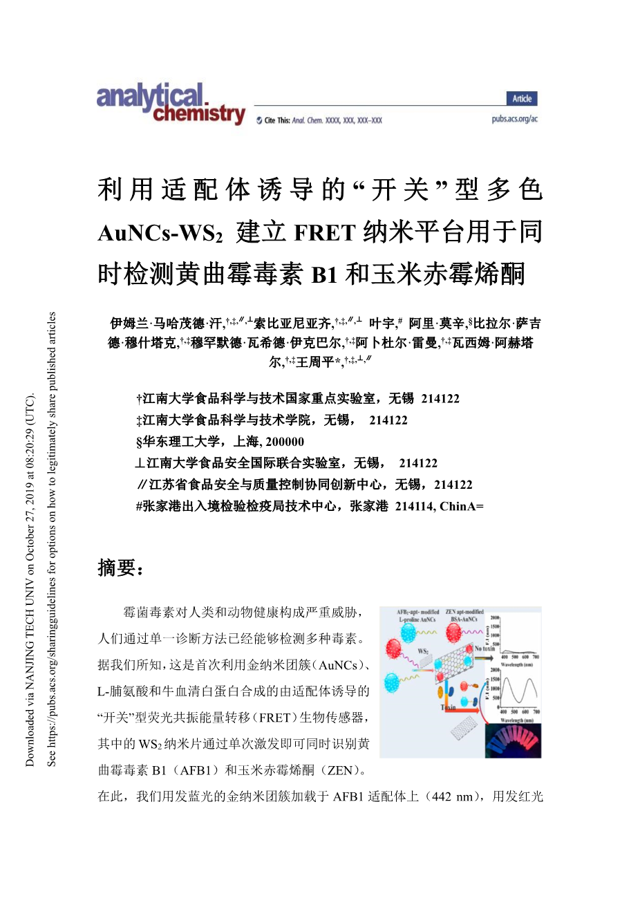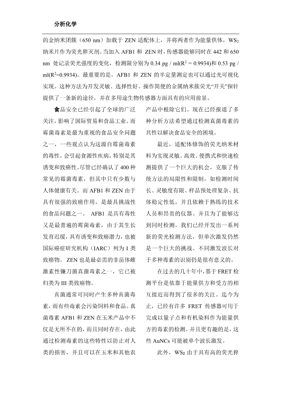 - 利用适配体诱导的“开关”型多色 AuNCs-WS2建立FRET纳米平台用于同 时检测黄曲霉毒素B1和玉米赤霉烯酮外文翻译资料