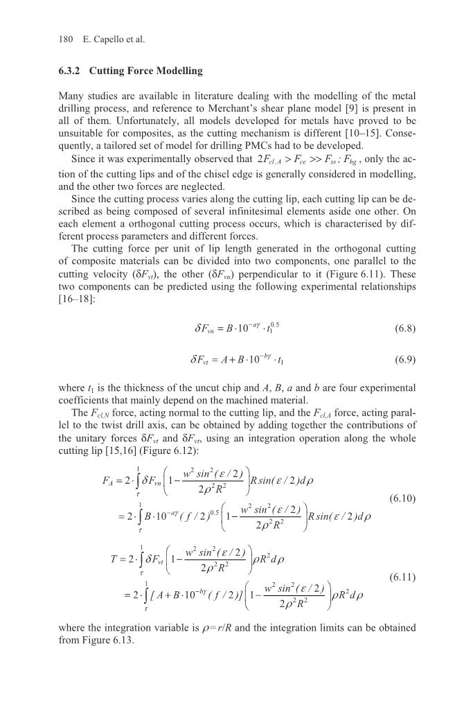 在复合材料的正交切割中产生的每单位唇长度的切割力可以分为平行于切割速度(delta;Fvt)的两个部件,垂直于切割速度的另一个(delta;Fvn)(图6.11)。可以使用以下实验关系来预测这两个组成部分[16-18]:
