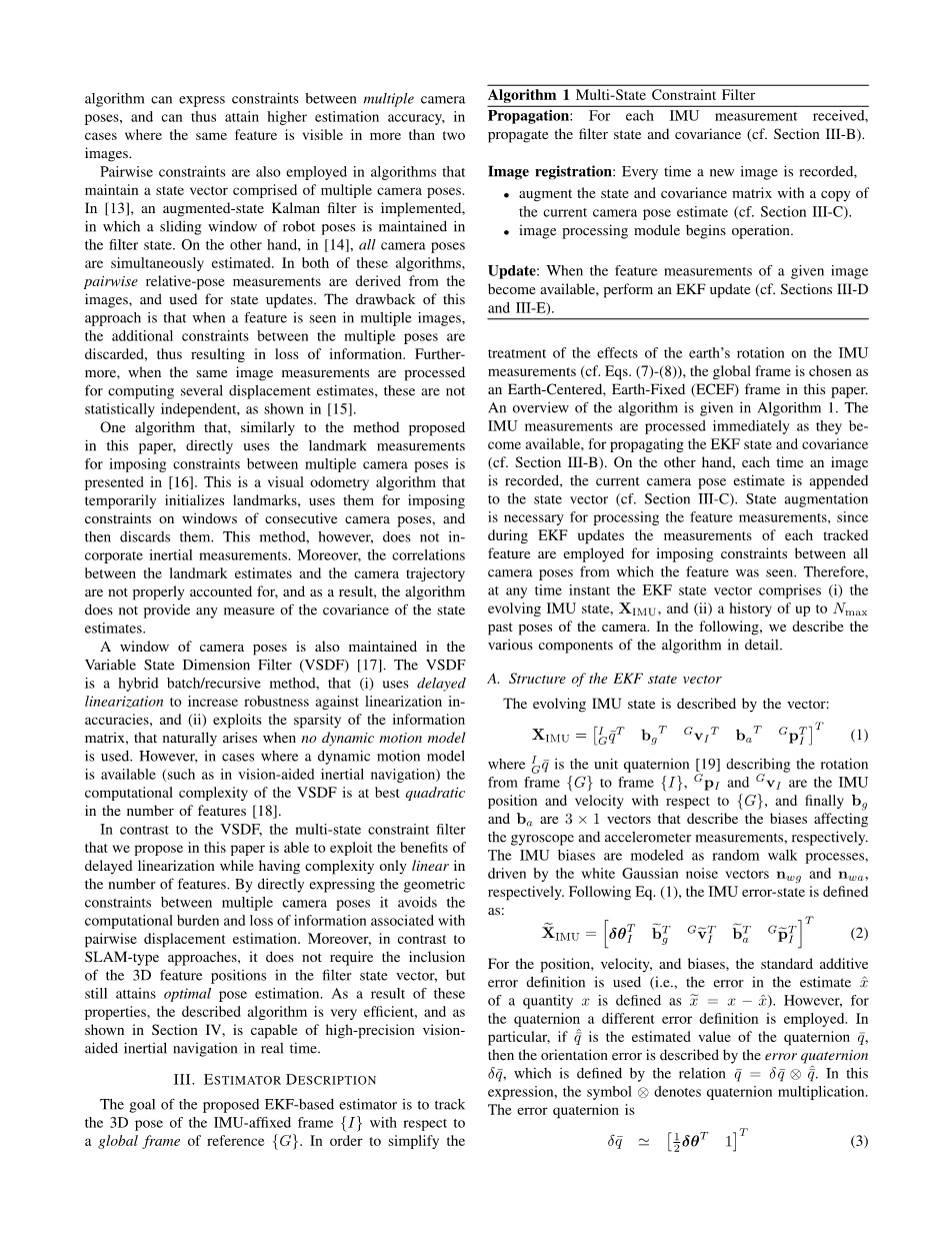 与VSDF相比,多状态约束过滤器我们在本文中提出的能够利用以下优势延迟线性化,而复杂度仅线性化功能数量。通过直接表达几何多个相机姿势之间的约束可以避免计算负担和与之相关的信息丢失成对位移估计。而且,与SLAM类型的方法,不需要包含过滤器状态向量中的3D特征位置仍可获得最佳姿势估计。由于这些属性,所描述的算法非常有效,并且第IV节中显示的功能能够实时进行高精度视觉辅助惯性导航。