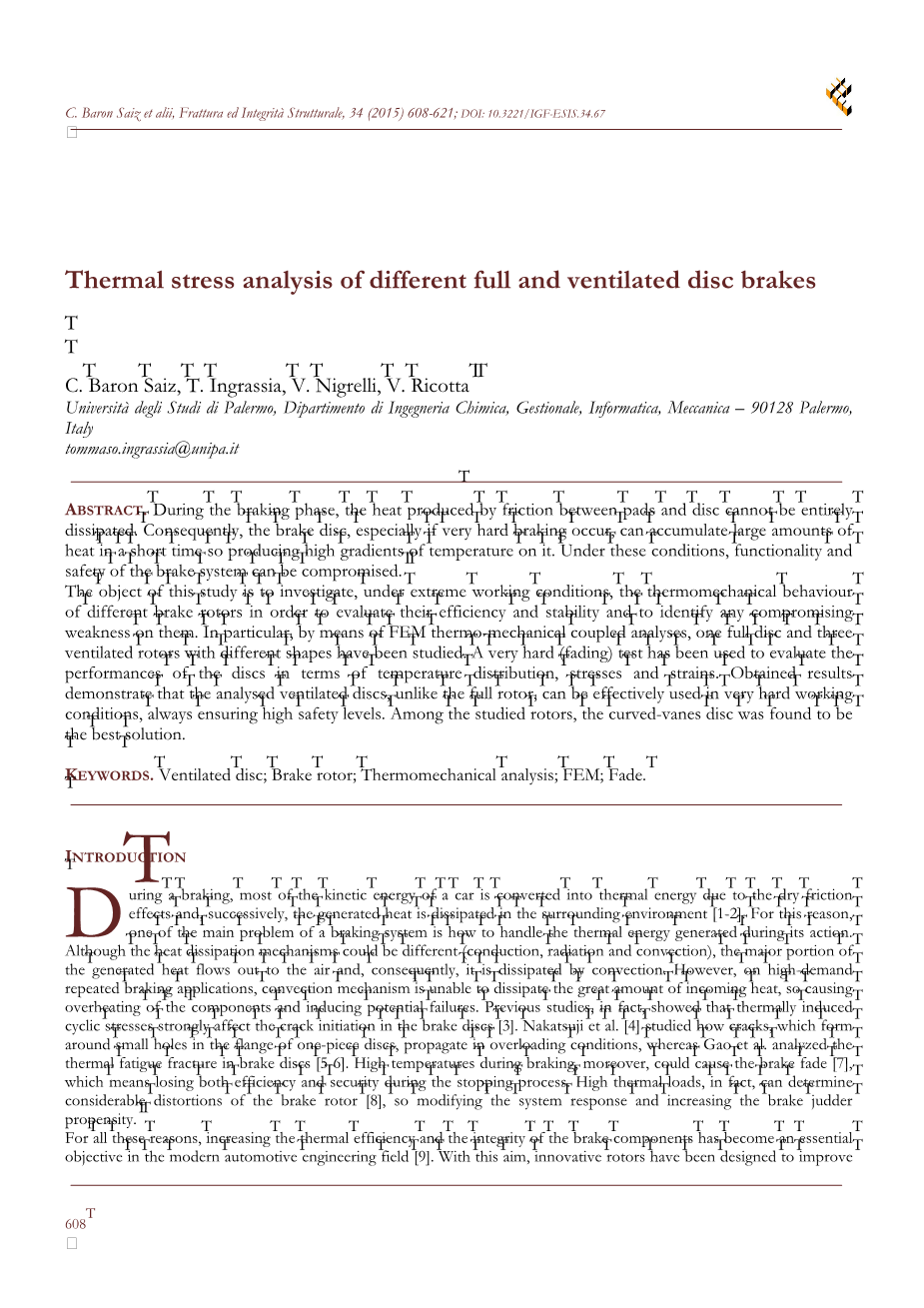 在这篇论文中,研究了不用形状的通风盘通过热机械耦合分析来评估它们的性能。还对实心盘进行热机械耦合分析,以便来量化在紧急制动条件下使用空气通道的优点。这个项目已经进行了如下工作:第一步,建立逆向工程过程,目的是创建被分析的盘式制动器的CAD参数化模型。此外,在该阶段中,制动盘的几何形状已经被适当地修改并以最正确和一致的方式比较结果;第二步,使用Ansys软件的有限元代码通过耦合热结构分析来模拟仿真测试制动衰退【13,14】;最后一步,将所有被分析的制动盘的结果进行分析处理,在温度、应变和应力分布方面进行比较。