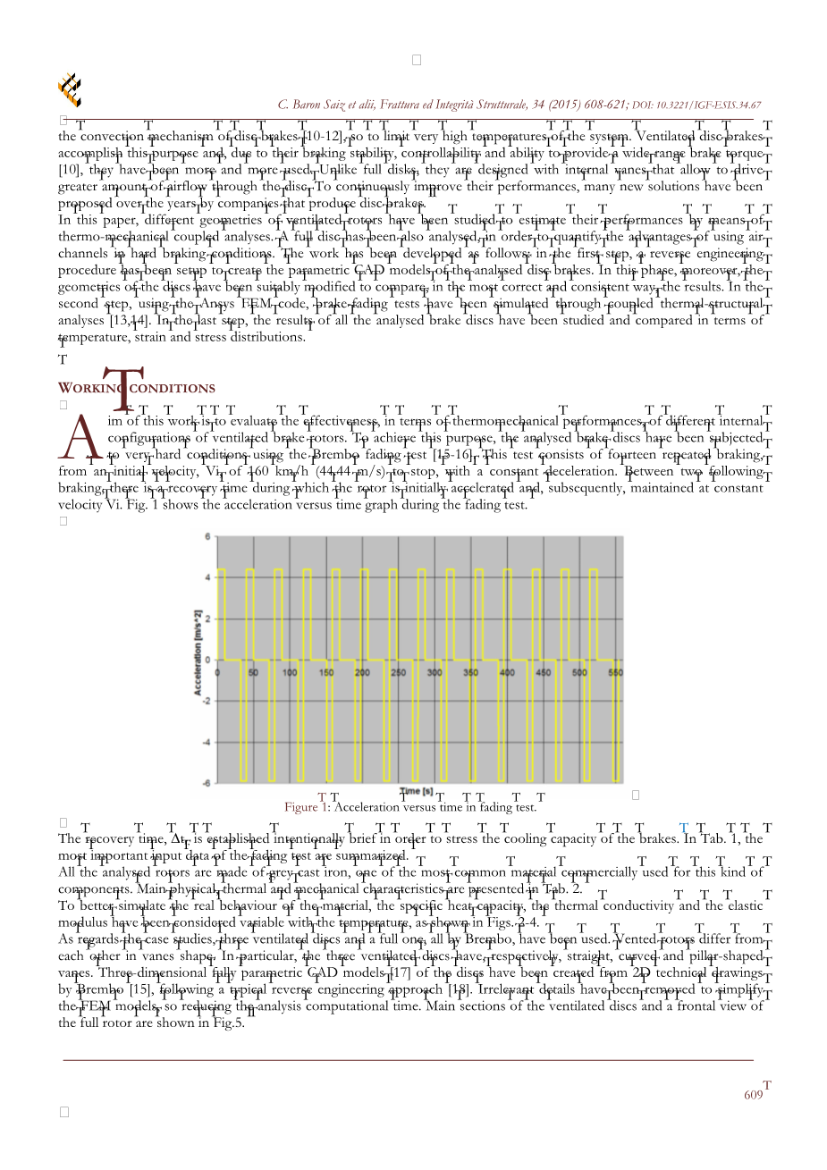 这项工作的目的是评估通风式制动盘不同的内部结构在热机械性能方面所产生的实际效果。为了达到这个目的,被分析的制动盘已经在严峻的条件下经过布雷博衰退测试【15-16】。这项测试包含十四次重复制动,是在恒定的减速度条件下,从初始速度Vi为160Km/h(44.44m/s)到停止。在随后的两个制动之间,存在一个制动盘一开始加速产生的恢复时间,然后保持在一个恒定的速度Vi。图1展现的就是在衰退测试过程中加速度与时间的关系图。