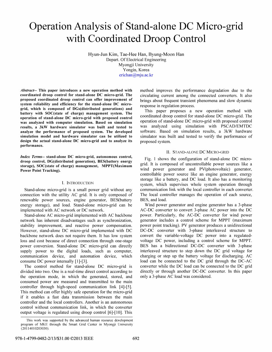 本文针对独立直流微网提出了一种新型的基于协调下垂控制的运行方法。研究中采用PSCAD/EMTDC软件仿真对采用所述控制方法的独立直流微网进行分析。基于仿真结果,建立了一个3KW的仿真硬件仿真平台并用其对拟采用的系统性能进行分析。