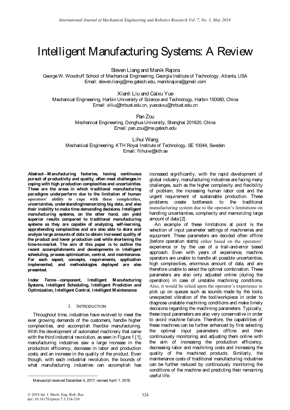 摘要 制造业工厂不断追求生产率和质量,在应对高生产复杂性和不确定性方面经常遇到挑战。由于人类操作员处理这些复杂性、不确定性、理解/记忆大数据的能力有限,以及他们无法做出耗时的决策,传统制造模式在这些领域表现不佳。另一方面,与传统制造系统相比,智能制造系统可以产生更好的结果,因为它们能够分析、自学习、理解复杂性,还能够存储和分析大量数据,以获得更高的产品质量和更低的生产成本,同时缩短上市时间。本文旨在概述智能调度、过程优化、控制和维护方面的最新成就和发展。对于每个方面,还介绍了概念、需求、实现的应用程序和部署的方法。