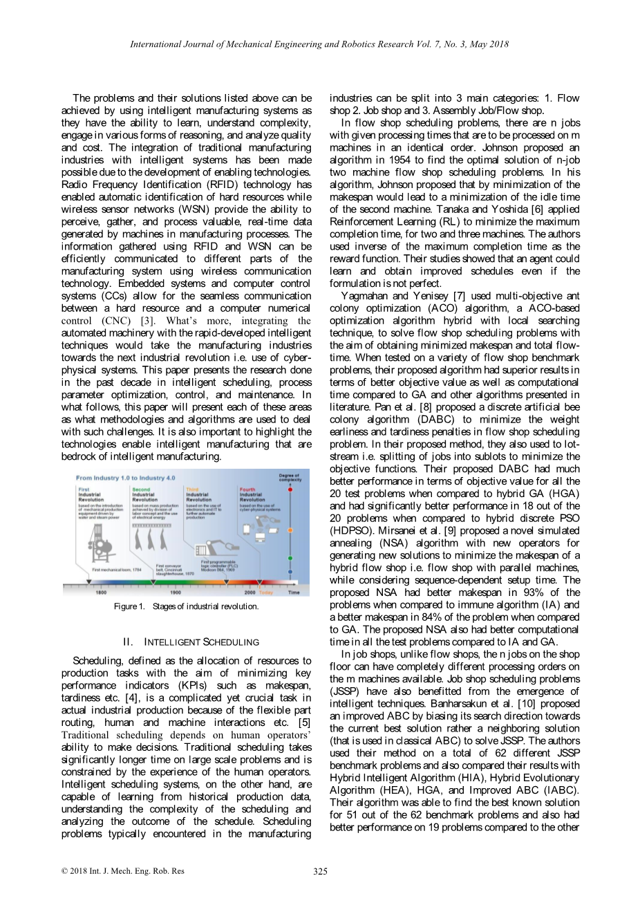 上述问题及其解决方案可以通过使用智能制造系统来实现,因为它们具有学习、理解复杂性、参与各种形式的推理以及分析质量和成本的能力。由于使能技术的发展,传统制造业与智能系统的集成成为可能。射频识别(RFID)技术实现了硬资源的自动识别,而无线传感器网络(WSN)提供了感知、收集和处理制造过程中机器生成的有价值实时数据的能力。使用RFID和WSN收集的信息可以通过无线通信技术高效地传输到制造系统的不同部分。嵌入式系统和计算机控制系统(CCs)允许硬件资源和计算机数控(CNC)之间的无缝通信[3]。此外,将自动化机械与快速发展的智能技术相结合,将使制造业走向下一次工业革命,即使用网络物理系统。本文介绍了过去十年在智能调度、过程参数优化、控制和维护方面所做的研究。在下文中,本文将介绍这些领域中的每一个领域,以及使用哪些方法和算法来应对这些挑战。同样重要的是,要突出智能制造的基础技术。