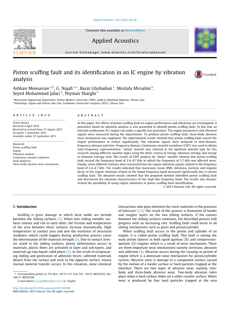 活塞磨损故障 发动机振动分析 连续小波变换 故障诊断 三体磨损磨损机理