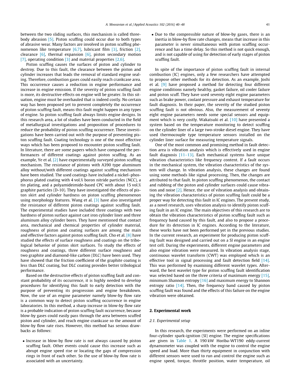故障检测领域中最常见和最有说服力的方法之一是有效用于发动机故障诊断中的振动分析[11-13]。每个机械系统都有独一无二的振动特性如频率。如果机械系统中发生故障,系统的振动特性会改变。在振动分析中,使用信号处理发现了这些变化等方法。然后,变化是归因于这个错误。在活塞磨损现象中,活塞和气缸表面的接触并且摩擦可能会引起振动和噪音[2]。因此,使用振动分析和获取活塞磨损故障的振动特性可能为检测IC发动机故障的正确方法。目前作为一项新颖的研究,使用振动分析来识别IC中的活塞磨损故障。这项研究的主要目的是获得活塞磨损故障的振动特性例如频段造成的故障,并提出了一个程序用于在IC中检测。据文献所知,以前的研究中这些工作还没有完成。在目前的研究中,生产活塞磨损试验故障是在发动机的SI引擎上设计和执行的测试单元。在实验中,可以检测不同的发动机参数和测量发动机振动。在振动分析阶段,连续小波变换(CWT)是一种信号处理和故障检测领域的有效工具[14]。这是通过检查不同的小波类型进行的。之后,用于活塞磨损故障识别的最佳小波型基于最大能量的三个标准[15],最小香农熵[16]和香农的最大能量熵比[14]。然后,发现活塞磨损故障引起的频带和观察到发动机故障的影响。