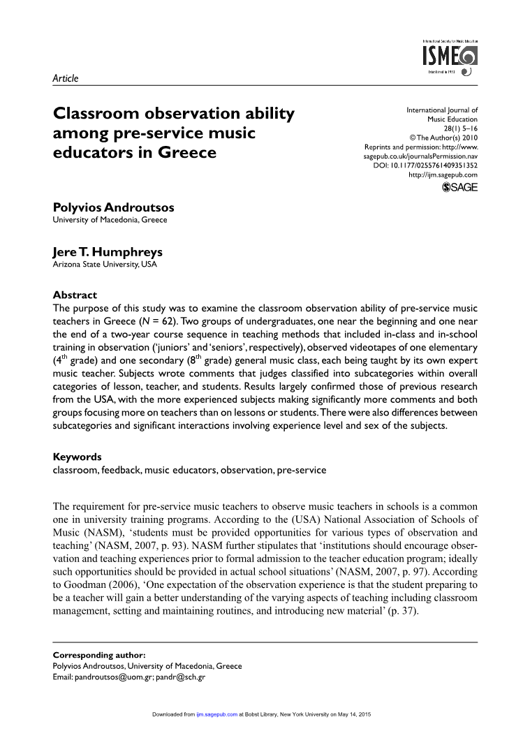 希腊大学的职前音乐教师被要求观察上课中的音乐教师,作为他们学位课程的一部分。然而,在不同的教育机构中,所需观察的数量、长度、设置和准备工作都有很大的差异。本研究旨在描述并比较一个希腊音乐教师培训项目中的职前音乐教师在培训前后的观察情况。