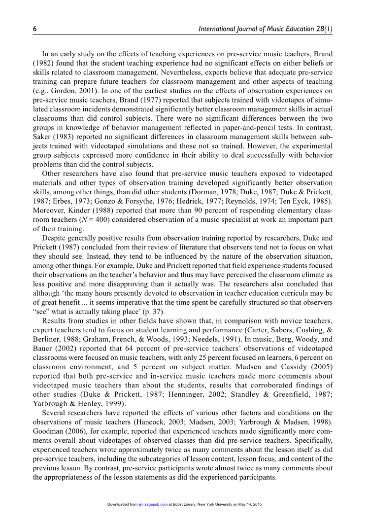 在大学培训项目中,要求职前音乐教师观察在职音乐教师是一个常见的要求。根据(美国)全国音乐学校协会(NASM),“必须为学生提供各种观察和教学的机会”(NASM,2007,第93页)。NASM进一步规定,对于教师教育计划,机构应鼓励职前教师的观察和教学经验;理想情况下,这种机会应在实际学校情况下提供(NASM,2007年,第97页)。Goodman(2006)指出,“观察经验的一个期望是,准备成为教师的学生能够更好地理解教学的各个方面,包括课堂管理、设置和维持常规,以及引入新物质”第37页)。