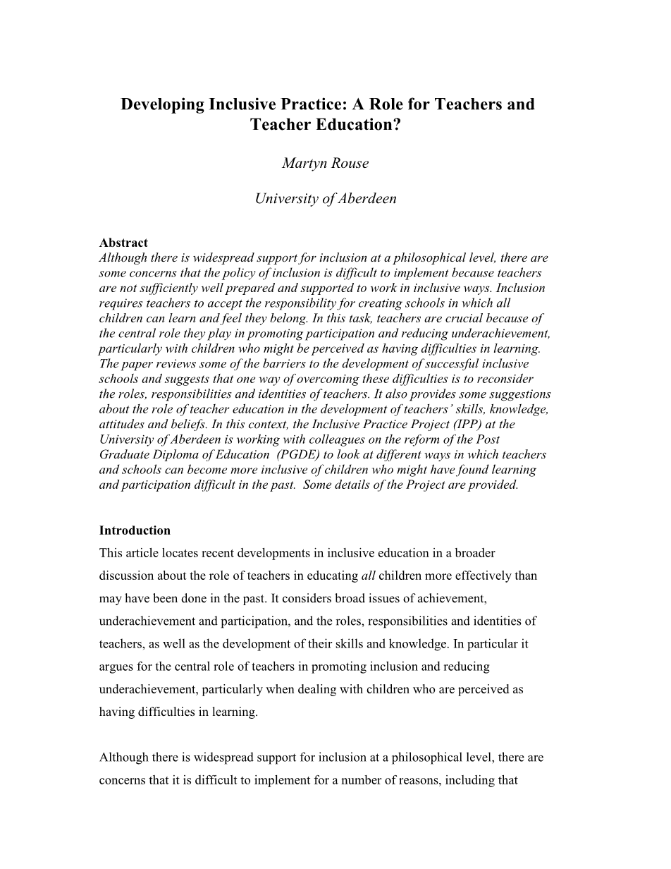 尽管在哲学层面上,人们普遍支持全纳教育,但也有人担心,由于一些原因,全纳教育难以实施,包括教师不知道如何去实施,为了解决这一问题,阿伯丁大学成立了全纳实践项目(IPP)。IPP的核心任务是与同事们合作,对教育学研究生文凭(PGDE)进行改革,并研究如何使教师和学校对过去可能发现学习和参与困难的儿童更加包容。