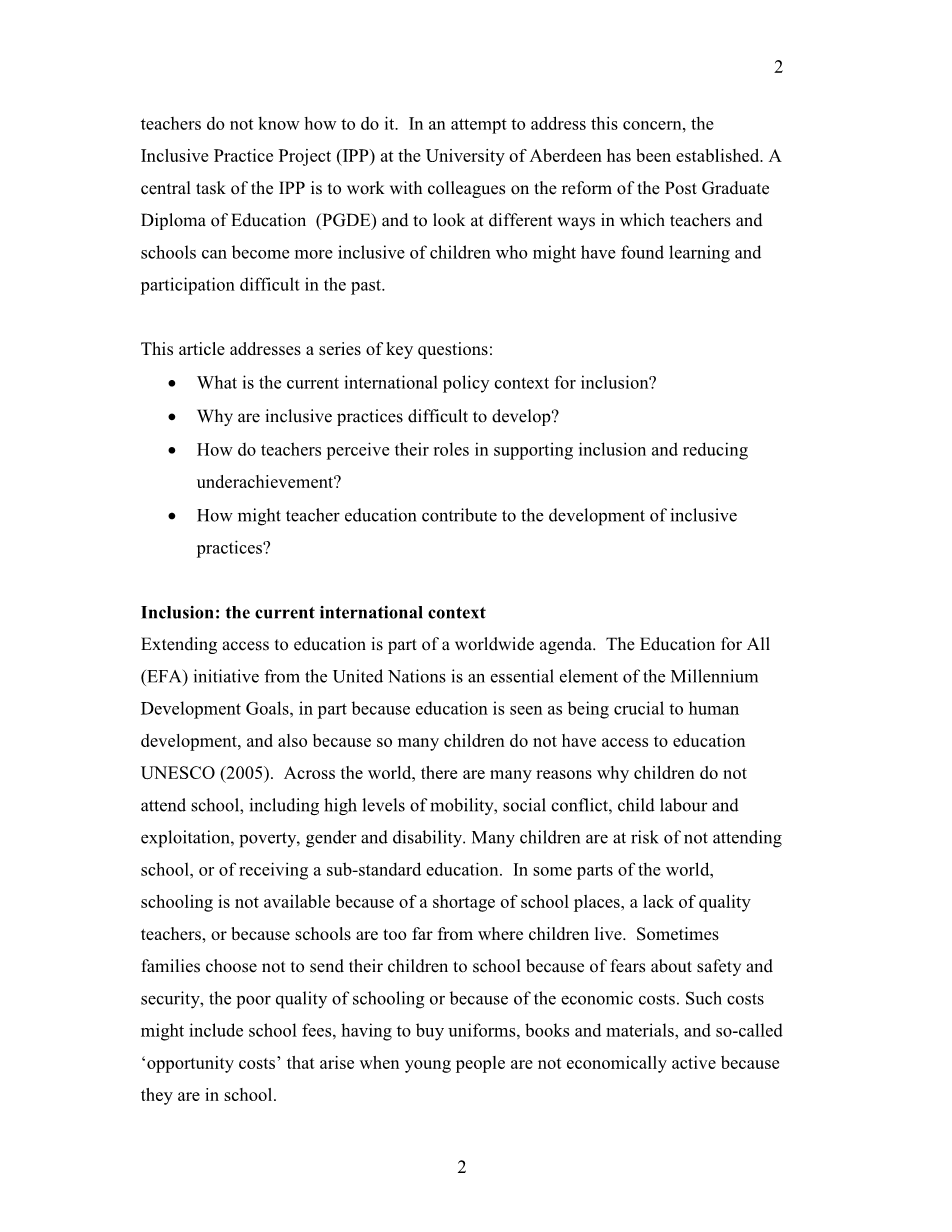 扩大教育机会是全球议程的一部分。联合国的全民教育(EFA)倡议是千年发展目标的一个基本要素,部分原因是教育被视为人类发展的关键,也因为许多儿童没有受教育的机会,联合国教科文组织(2005)。在世界各地,也因为许多儿童没有受教育的机会,包括流动性大、社会冲突、童工和剥削、贫困、性别和残疾。许多儿童有可能不上学,或接受低于标准的教育。在世界的一些地方,由于学校名额不足,缺乏高质量的教师,或者由于学校离儿童居住地太远,所以无法上学。有时,家庭选择不送孩子上学,是因为担心安全和安保问题,学校教育质量差,或者因为经济成本问题。这些成本可能包括学费、必须购买校服、书籍和材料,以及所谓的“机会成本”,即年轻人因为上学而无法从事经济活动。接受教育的机会和结果的差异,不仅取决于儿童的个人情况,而且关键是取决于他们生活的国家,在许多情况下,他们生活在这个国家。在教育良好、在国际上取得成功的国家,如苏格兰,由于其长期实行义务教育,这种担忧似乎无关紧要,但即使在这里,也不是所有儿童都在学校。即使在学校里,一些儿童也没有积极的教育经历,他们在学校里也没有什么可展示的。包括苏格兰在内的许多国家,所谓的“成绩差距”是一个主要问题(OECD,2007)。作为回应,诸如“更多选择,更多机会”(SEED,2006)等新举措已被引入以解决这一问题。在这些国家,人们关注的不仅是入学机会,而且还关注确保有意义地参与到一个所有人都能获得成就和成功的体系中(Black-Hawkins,Florianamp;Rouse,2007)。但是,为什么在许多国家会有如此多不佳的成绩?为什么教育系统对参与度和成就有制度上的障碍?还有,为什么这么多的教师认为,一些学生在学习上的问题不应该是他们的责任,会是因为他们没有接受过处理这些问题的培训吗?