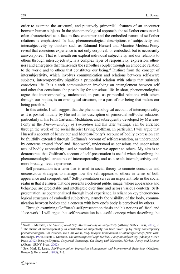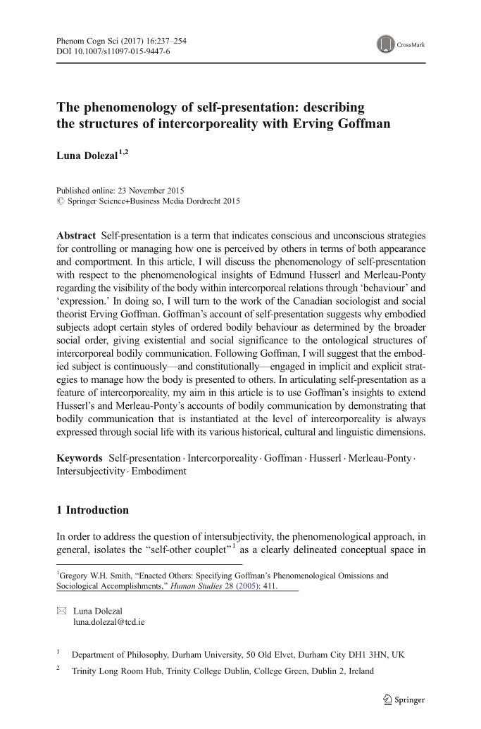 外文文献出处:Luna Dolezal. The phenomenology of self-presentation: describing the structures of intercorporeality with Erving Goffman[J]. Phenomenology and the Cognitive Sciences,2017,16(2):237-254.