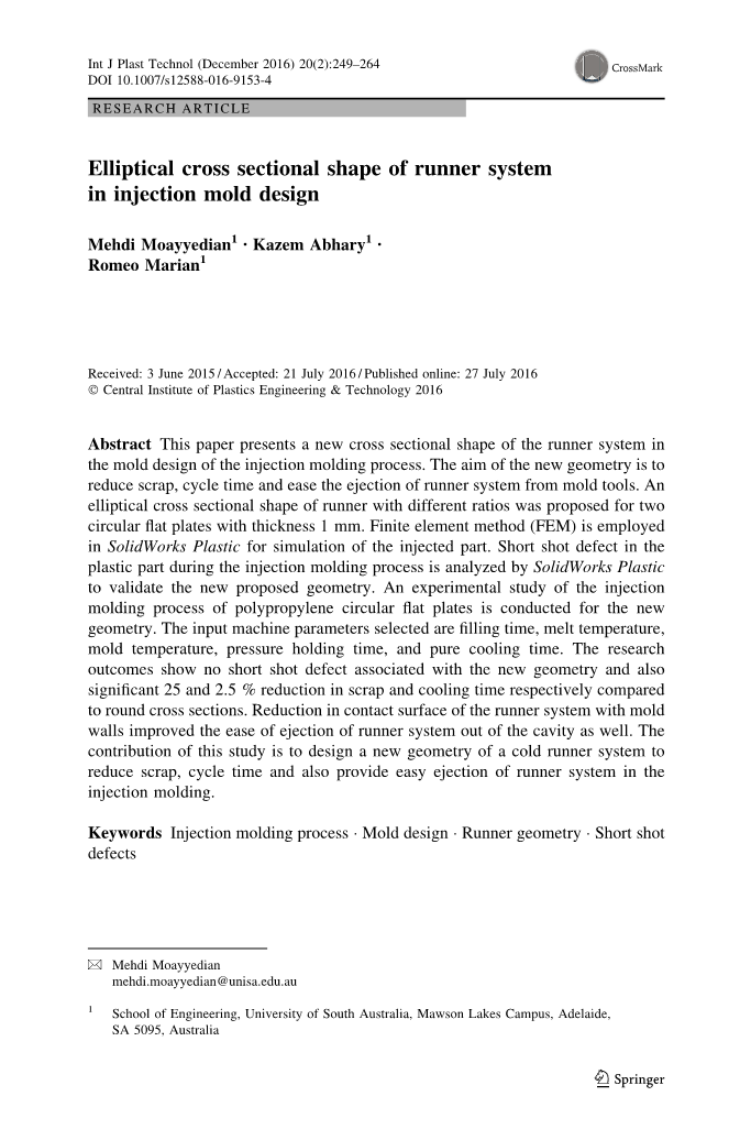 摘要:本文提出了模具中流道系统新横截面形状设计的注塑工艺。新的几何形状的目的是减少废料,循环时间和易于从模具工具中排出流道系统。对于厚度为1mm的两个圆形平板,提出了具有不同比率的流道的椭圆形横截面形状。在SolidWorks Plastic中使用有限元方法(FEM)来模拟注入的零件。在注塑过程中塑料部分的短射缺陷由SolidWorks Plastic分析,以验证新建议的几何体。对于新的几何形状进行聚丙烯圆形平板的注射成型工艺的实验研究。所选择的输入机器参数是填充时间,熔体温度,模具温度,保压时间和纯冷却时间。研究结果表明,与圆形横截面相比,与新的几何形状相关的短射缺陷以及废料和冷却时间分别显着降低25和2.5%。流道系统与模具壁的接触表面的减小改善了流道系统从腔中排出的容易性。这项研究的贡献是设计一个新的几何形状的冷流道系统,以减少废料、循环时间,还提供了在注塑成型中的容易弹出浇注系统。
