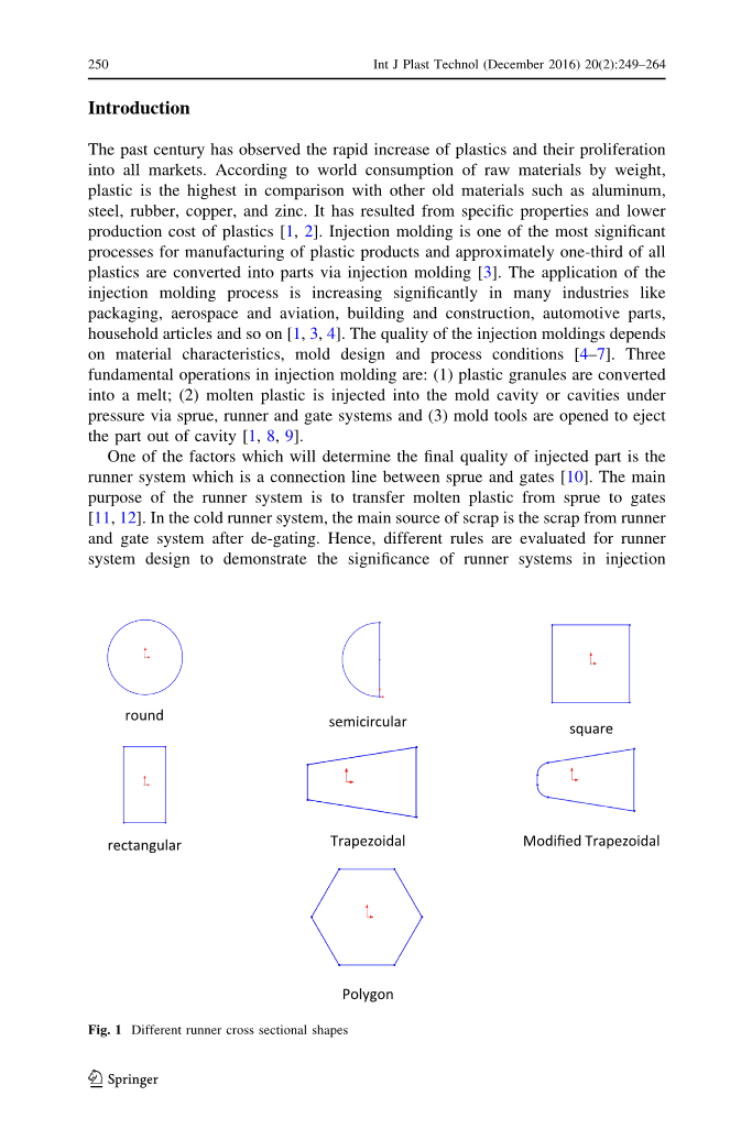 在注塑成型中,流道系统最常见的横截面形状是圆形。 在选择圆形用于特定零件设计时,三个主要元素是(a)较小的流道尺寸以最小化废料;(b)容易从中弹出模具工具;(c)用最小的凹痕,焊缝快速填充空腔,并且没有短射 [13-15]。 本文的目的是研究新的流道系统几何形状以导致最少的废料,被定位在流动中心线的浇口,适当地充满型腔,并方便地从模具中轻松弹出零件。 为此目的,椭圆形或半椭圆形的横截面形状已被调查并准确地与圆形横截面形状的浇道系统进行比较。