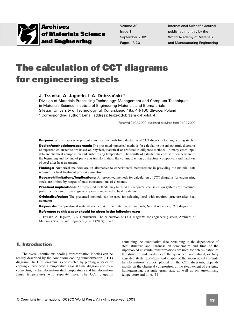 参考本文应按以下方式提供:J.Trzaska,A.Jagiełło,L.A.Dobrzański,工程钢的CCT图计算,材料科学与工程39/1(2009)13-20。
