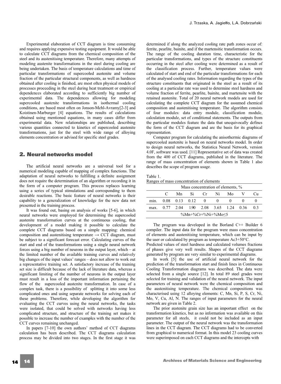 用于计算过冷奥氏体的等温线图的计算机程序基于神经网络模型。 为了设计神经网络,使用Statistica神经网络软件,版本4.0F。[11]代表性的数据集是从文献中发表的CCT图400中创建的。 表1中所示的元件的质量浓度范围还描述了程序使用的范围。
