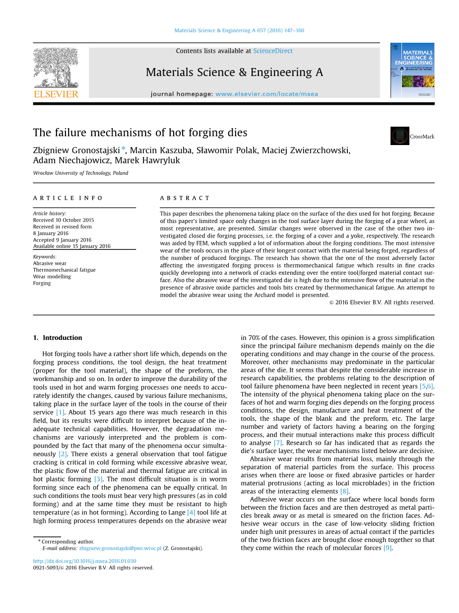 本文描述了在用于热锻时,模具表面上发生的现象。因为本文仅仅有限的研究了在齿轮锻造过程中工具表面层的变化。但很多研究表明,在其它两个闭模锻造工艺的情况下,即分别对盖和轭的锻造,也分别观察到类似的变化。这个调查由FEM辅助,其提供了关于锻造条件的大量信息。最强烈的工具的磨损发生在它们与被锻造材料的最长接触的位置,而不管生产锻件的数量。研究表明,影响研究的锻造过程最不利的因素之一是热机械劳,它导致细裂纹迅速发展成在整个工具/锻造材料接触表面上延伸的裂缝网络。所研究的模具的磨料磨损也有一部分是因为材料在磨料氧化物表面的强烈流动和热机械疲劳产生的工具钻头。于是尝试使用Archard模型模拟磨料磨损现象。