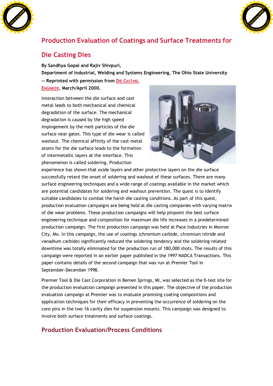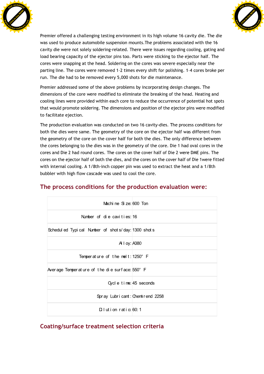 本文提出的生产评估活动的szlig;测试场所选择了位于美国密歇根州不来梅斯普林斯的Premier Tool&Die Cast公司。Premier进行生产评估活动的目的是选出有可能的涂层组合物和应用技术,以防止在用于悬挂安装的两个16腔模具中的芯销上出现焊接效果。该活动设计包括表面处理和表面涂层。