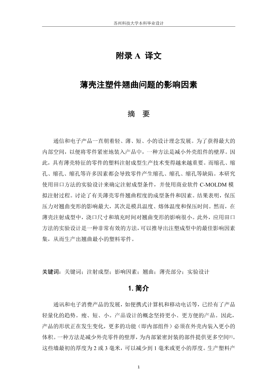 薄壳注塑件翘曲问题的影响因素外文翻译资料 2023-05-17 09:56:55 英语原文共 9 页,剩余内容已隐藏,支付完成后下载完整资料 英语译文共 14 页,剩余内容已隐藏,支付完成后下载完整资料 资料编号:[591234],资料为PDF文档或Word文档,PDF文档可免费转换为Word 您需要先支付 30元 才能查看全部内容!立即支付 发小红书推广免费获取该资料资格。点击链接进入获取推广文案即可: Ai一键组稿 | 降AI率 | 降重复率 | 论文一键排版 PREVIOUS NEXT 您可能感兴趣的文章 掺杂磷钼酸催化剂的合成研究开题报告 稀土掺杂透明微晶玻璃制备及光学性能的研究文献综述 ZnO纳米晶的暴露晶面调控及其光催化稳定性研究文献综述 薄壳注塑件翘曲问题的影响因素外文翻译资料 微型综述:微/纳米级MnMoO4作为先进超级电容器电极材料的研究进展外文翻译资料 为低温条件设计先进的锂电池外文翻译资料 可再生、可持续的能源评论外文翻译资料 基于天然红甜菜色素碳点荧光检测食品中四环素外文翻译资料 SnO2纳米粒子的绿色化学合成方法及其在光催化降解铬黑T染料中的应用外文翻译资料 磁性水热炭对过硫酸盐的可见光激活用于细菌灭活:有效性、可回收性和机制外文翻译资料