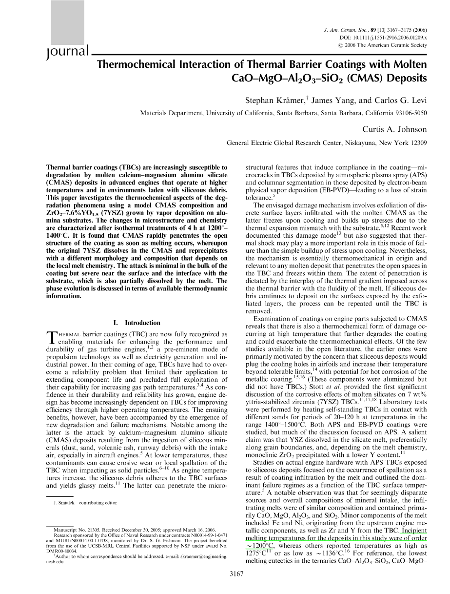在充满硅质残渣的环境和高温的操作环境中,发动机前端的热障涂层(TBC)很容易就被熔融的镁铝硅酸盐(CMAS)腐蚀。本文通过模拟在氧化铝基底上布置气相沉积生长的模型CMAS组合物和ZrO 2 -7.6%YO1.5(7YSZ),从而研究其腐蚀现象的热化学方面。其微观结构及化学性质在1200℃°-1400℃下等温处理4小时后,将会被表征出来。研究发现,一旦涂层发生熔融,CMAS就会迅速地渗透涂层,从而致使原有的7YSZ溶解在CMAS中再沉淀,使局部熔体有着不同的形态以及组成。这种腐蚀极少成片地出现,但部分溶解于涂层熔体的CMAS会剧烈的腐蚀涂层表面至接近基地的界面区域。根据现有的热力学信息来讨论相变。