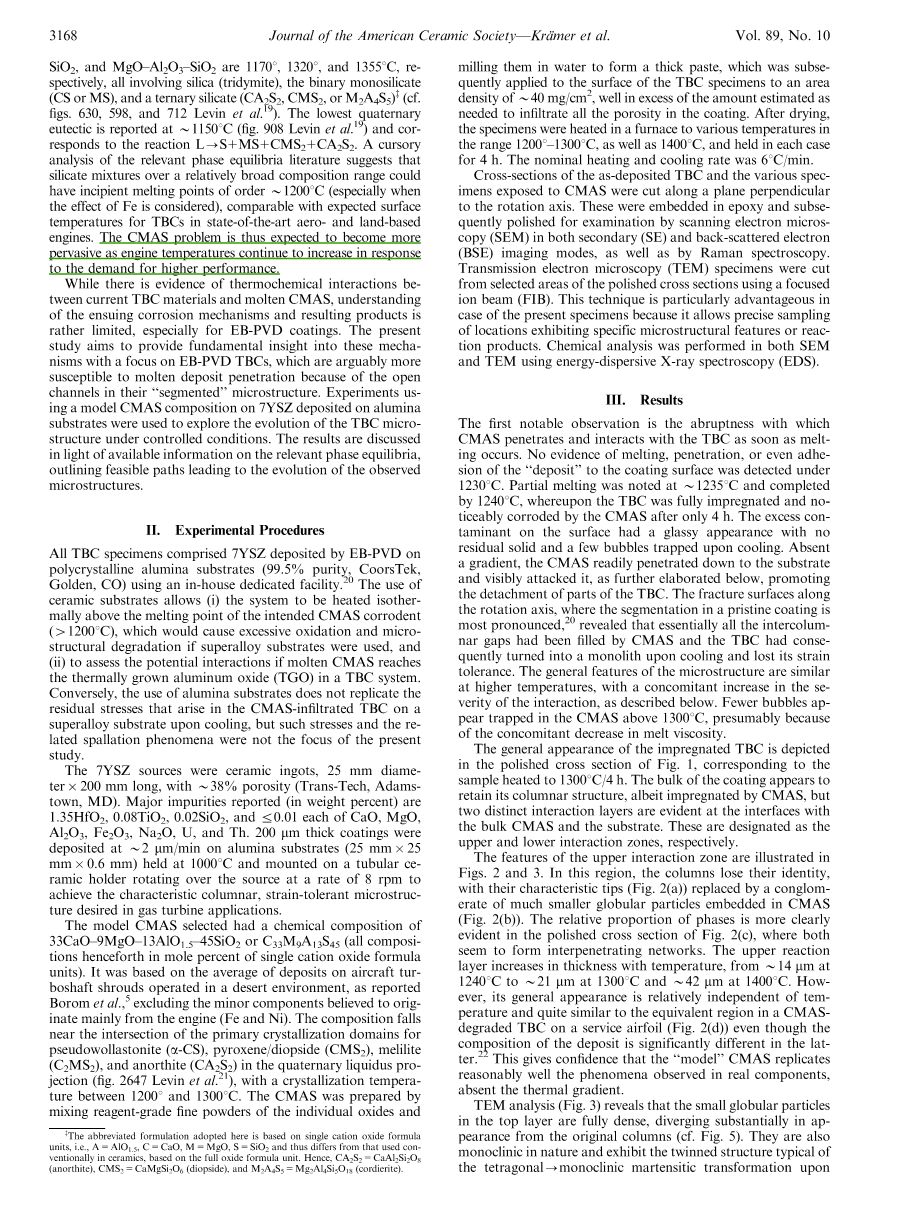 所选择的模型CMAS具有33CaO-9MgO-13AlO1.5-45SiO2或C33M9A13S45(以单一阳离子氧化物配方单元的摩尔百分比计的组成)的化学组成。它是基于在沙漠环境中操作的飞机涡轮轴罩上的沉积物的平均值,如Borom等人报道的,不包括主要来自发动机(Fe和Ni)的微量成分。该组合物落在四级液相线投影中主要结晶区交点的附近(假硅灰石(-CS),辉石/透辉石(CMS2),翠绿石(C2MS2)和钙长石(CA2S2))(图2647 Levin等人),结晶温度为1200℃-1300℃。通过混合各种氧化物的细粉末并将它们在水中研磨以形成稠糊剂来制备CMAS,随后将其施加到TBC样品的表面上,使其面积密度约为40mg / cm2,远远超过估计为渗透涂层中所有孔隙所需的量。在干燥之后,将样品在炉中加热到1200℃-1300℃以及1400℃的各种温度,并且在每种情况下保持4小时。加热和冷却速率为6℃/ min。