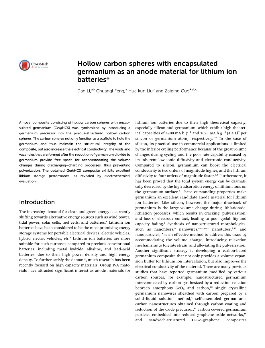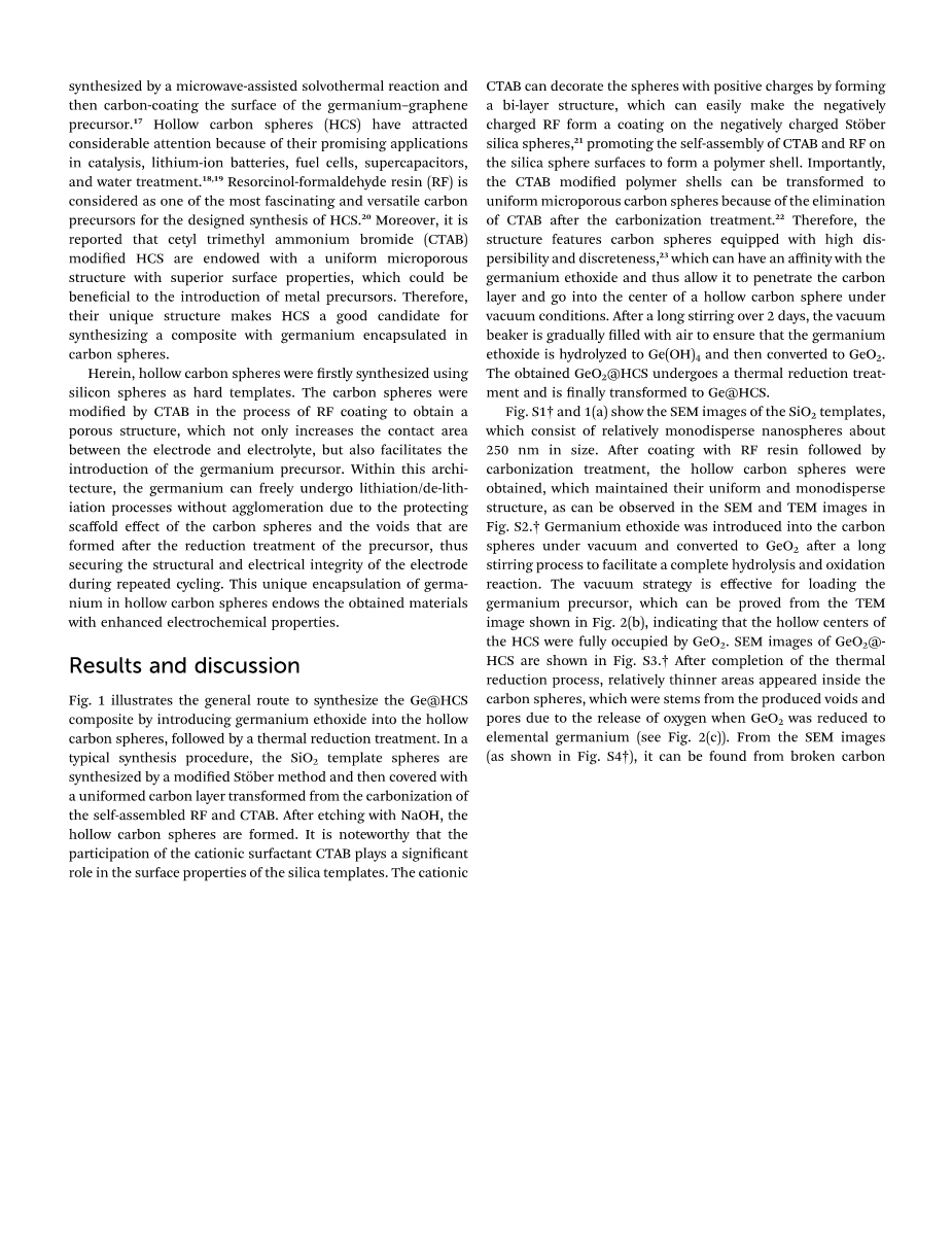 日益增长的对清洁和绿色能源的需求正在转向如风能,潮汐能,太阳能电池,燃料电池,蓄电池.【1】锂离子电池被认为是便携式电子设备、电动汽车、混合动力电动汽车等设备的最有前途的能源存储系统。【2】由于锂离子电池具有的高功率密度及其高能量密度,相比以前的传统电池,包括金属氢化物、碱性电池、铅酸电池,锂离子电池则更具有优势。为了进一步满足人们的需求, 最近的许多研究都集中在高容量的材料。第四主族材料因其具有高理论容量的特点,很适合做锂离子电池的负极材料,尤其是硅和锗,分别表现出高达4200 mAhg-1和1623 mAhg-1的理论容量 (4.4Li /硅或锗原子)。【3-6】对于硅来说,其在商业应用中的实际应用受到循环性能差的限制,因为硅在循环期间的具有较大体积变化和由其固有的低离子折射率和电子导电性引起的差的速率能力。与硅相比,锗可以将导电性提高两个数量级,并且锂的反射率提高四个数量级。【3,7】此外,人们已经证明,通过锂离子在锗表面上的高吸附能量,总系统能量可以显着降低。5这些杰出的性能促使锗成为锂离子电池的极好的候选阳极材料。然而,锗的主要缺点就像硅一样,锗也存在于其锂化/脱锂过程期间的大体积变化的问题,这可能会导致材料的开裂、粉碎和电极接触的损失,进而会致使其循环性变差和容量衰减。【8】纳米结构形貌,如纳米棒,【9】纳米线,【4,8,10-12】纳米管,【5,13】和纳米颗粒【14】的合成是一种有效的解决这个问题的方法,通过适应体积变化,引入松弛机制以缓解应力,减轻粉化。另一个重要的策略是开发碳基锗复合物,其不仅提供用于锂离子嵌入的体积膨胀缓冲,而且还可以改善材料的导电性。有许多先前的研究报道了通过各种碳源改性的锗,例如,通过由无定形GeO2和碳之间的还原反应合成的碳互连的纳米结构锗,用固体-液体溶液法制备的15个单晶锗纳米线,通过碳涂覆和还原氧化物前体获得的4个自组装锗碳纳米结构,嵌入还原氧化石墨烯网络中的14个碳覆盖的锗颗粒和通过微波辅助溶剂热合成的夹心结构的C-Ge-石墨烯复合物,然后碳涂覆锗-石墨烯前驱体上。【17】中空碳球(HCS)由于其在催化,锂离子电池,燃料电池,超级电容器和水处理中的有前途的应用而受到了相当大的关注。【18,19】间苯二酚-甲醛树脂(RF)被认为是最引人注意的,用于中空碳球(HCS)的设计合成的多功能碳前驱体。20此外,据报道,十六烷基三甲基溴化铵(CTAB)改性的中空碳球(HCS)具有均匀的微孔结构,其具有优异的表面性质,这可有利于引入金属前驱体。 因此,它们独特的结构使得HCS成为合成具有包封在碳球中的锗的复合材料的良好候选。
