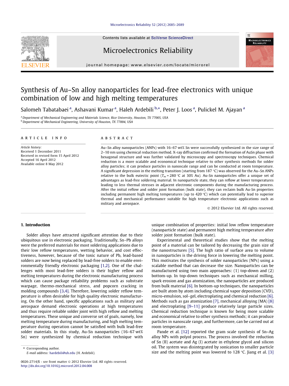 用化学还原法可以成功合成2-10nm级别的含16-67wt%Sn的Au-Sn合金纳米粒子(ANPs)。通过X射线衍射实验证实了Au-Sn合金的相是六角结构,同时通过显微镜和光谱技术进一步验证了这个结论。化学还原法相比于其他的钎料合金颗粒合成方法是一种可拓展的、经济的技术,这种方法可以在室温的环境下制备纳米级的颗粒。Au-Sn纳米粒子(从187℃开始)相对于大块共晶点(30%的金Tm=280℃)在熔化转变中有一个明显的温度下降。Au-Sn ANPs作为一种无Pb钎料具有一系列的独特的优势。在纳米状态,它们可以在较低的温度下进行回流焊从而减少在制作过程中对相邻的电子元件产生的热应力。在最初的回流焊接和焊点的形成(块状)之后,它们可以改良Au-Sn的大部分性能包括高的熔点(高达420℃)这可能导致很高的热稳定性和良好的机械性能,使其适用于高温电子应用,如军事和航空航天。