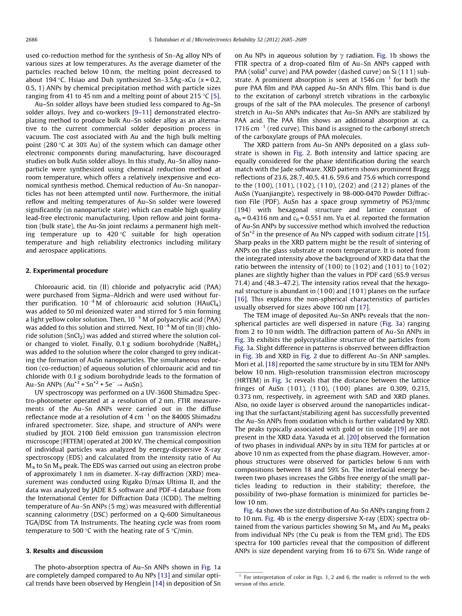 本工作的主要重点是突出化学合成的Au-Sn ANPs和显著降低其熔点。虽然一个详细的讨论是超出了本研究的范围,但值得一提的是,Au-Sn ANPs也可能具有其他优点。例如,EDX光谱(图4b)Au-Sn纳米粒子显示较低含量的Sn(16–67wt%)相比其他通常含有高Sn含量(96.5 wt%)的无Pb焊料的材料[28]。Sn原子的运动已被确定为在焊垫金属/金属钎焊过程中的界面扩散动力的主导因素。高Sn含量,Sn的活性,回流焊温度和时效温度的共同影响与金属间化合物(IMCs)相关,随后为了最佳焊点可靠性降低IMC厚度一般优先。金属间化合物可以导致焊点的机械性能显著减弱并导致使用应力下产生灾难性故障。因此,可以推测,Sn含量较低的Au-Sn颗粒可能通过形成薄的IMC导致对焊点的可靠性更加有利[28-30]。这种潜在的好处应该在未来的可靠性研究实验验证。