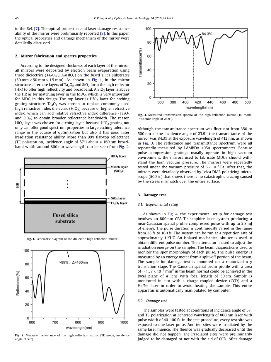 我们都知道,制造高反射镜是脉冲压缩光栅的最关键的步骤之一,因为光栅的性能直接与镜面的性能有关。根据宽带脉冲压缩光栅的要求,反射镜必须具有三个特性:高反射率,宽带宽和高的激光损伤阈值。在2011年,基于以上三个特性,我们设计并组装制造了一个反射镜 [7]。反射镜的光学性能和耐激光损伤能力得到了初步报道[8]。这篇文章详细讨论了反射镜的光学性能和激光损伤机理。