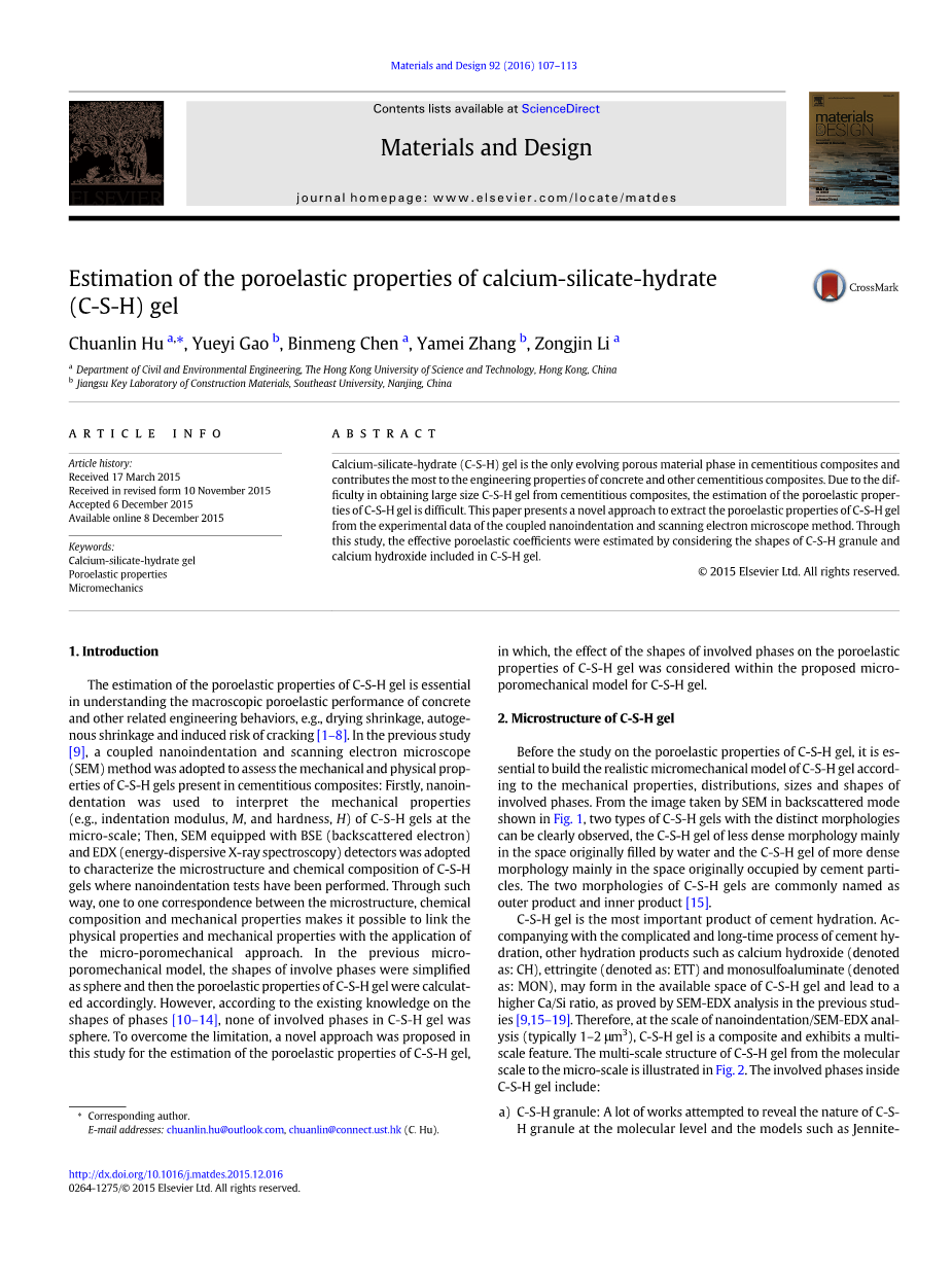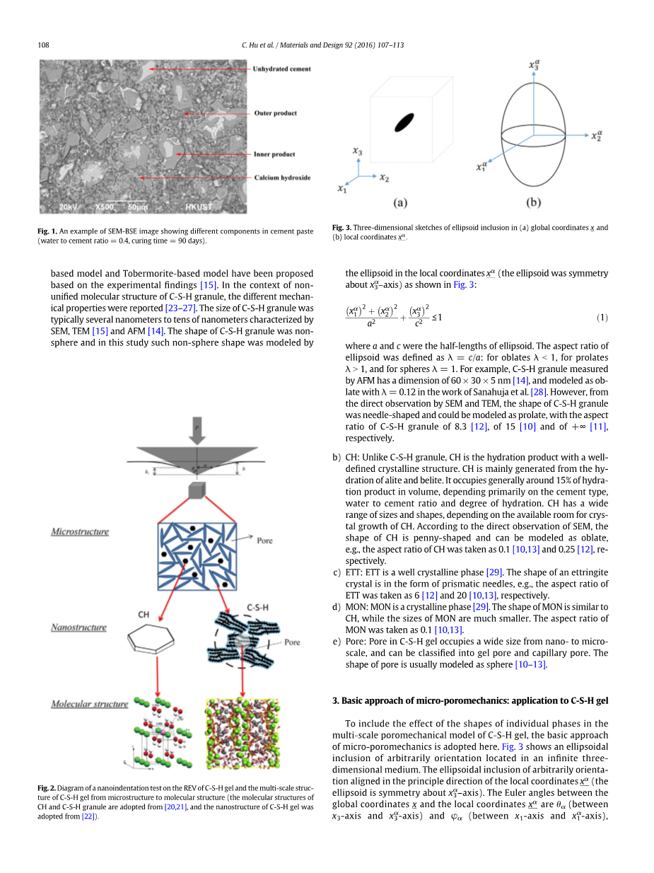 对C-S-H凝胶弹性性能的评估对理解宏观多孔弹性性能的混凝土和其他相关工程行为至关重要,例如、干燥收缩、自收缩和开裂的诱导风险[1–8]。以前研究采用纳米压痕技术和扫描电子显微镜(SEM)来评估存在于水泥基复合材料中C-S-H凝胶的力学和物理性质:首先,我们用纳米压痕技术来解释微观尺度的C-S-H凝胶的机械性能(例如,压痕模量,N,硬度H);接下来,我们使用配有背散射电子(BSE)的扫描电子显微镜和能量色散X射线光谱学(EDX)探测器来表示已经利用纳米压痕技术测试过的C-S-H凝胶的微观结构和化学成分。通过这种方法,微观结构,化学成分以及机械性能之间的一一对应使得将微孔隙力学性能方法与物理性能和机械性能联系在一起成为可能。在前面的微孔隙力学模型中,涉及到阶段的的形状被简化成球体,并且C-S-H凝胶的多孔弹性性能相应的也被计算出来了。然而,根据关于每一阶段相的现有知识[10–14],没有一个关于C-S-H凝胶相是球体。为了克服这一限制,本课题提出了一种新颖的方法中评估C-S-H凝胶的多孔弹性性能,其中,关于C-S-H凝胶的多孔弹性性能的各相形状的效果被考虑到了已提出的微孔隙力学模型。