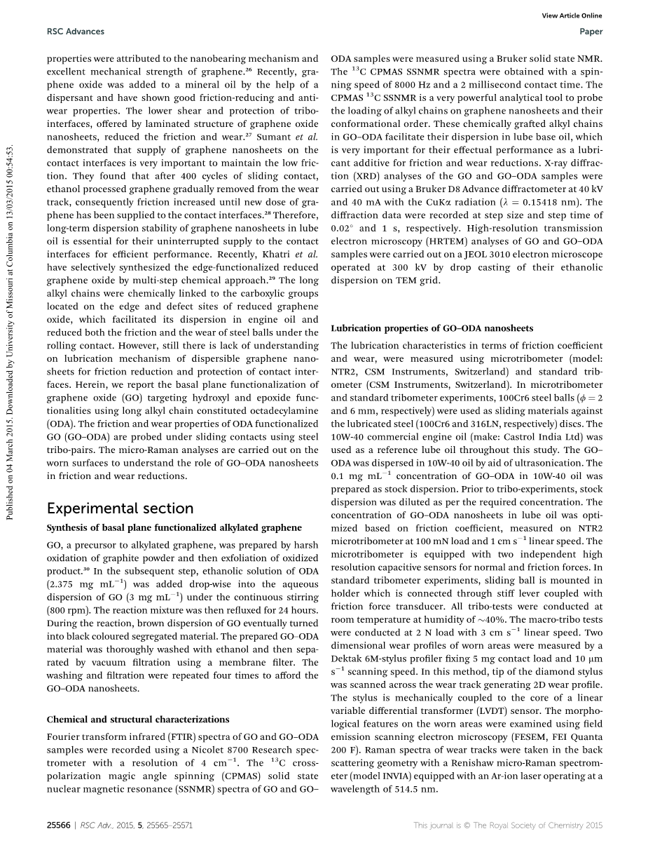 26近来,氧化石墨烯通过分散剂加入到矿物油中,并显示出良好的减摩和抗磨损性能。 由石墨烯氧化物纳米片的层压结构形成的摩擦界面的较低剪切减少了摩擦和磨损。27Sumant 等人表明在接触界面上供应石墨烯纳米片对于维持低摩擦非常重要。 他们发现,400次循环的滑动接触,乙醇处理的石墨烯逐渐从磨损轨道上移除,因此摩擦力增加,直到新剂量的石墨烯被提供给接触界面28。因此,长期的分散稳定性润滑油中的石墨烯纳米片对于其高性能接触界面的不间断供应至关重要。 最近,Khatri等人通过多步化学方法选择性合成了边缘功能化还原氧化石墨烯29。长链烷基化学键合于位于边缘和还原氧化石墨烯缺陷位置的羧基,有助于其在发动机油中的分散并降低了滚动接触下钢球的摩擦和磨损。 然而,对于可分散石墨烯纳米片的润滑机理还缺乏对降低摩擦和保护接触界面的理解。 在这里,我们报告氧化石墨烯(GO)的基面功能化使用长烷基链构成的十八烷基胺(ODA)靶向羟基和环氧化物的功能。ODA功能化GO(GO-ODA)的摩擦和磨损性能在使用钢摩擦副的滑动接触下进行探测。 对磨损表面进行微拉曼分析以了解GO-ODA纳米片在摩擦和磨损减少中的作用。