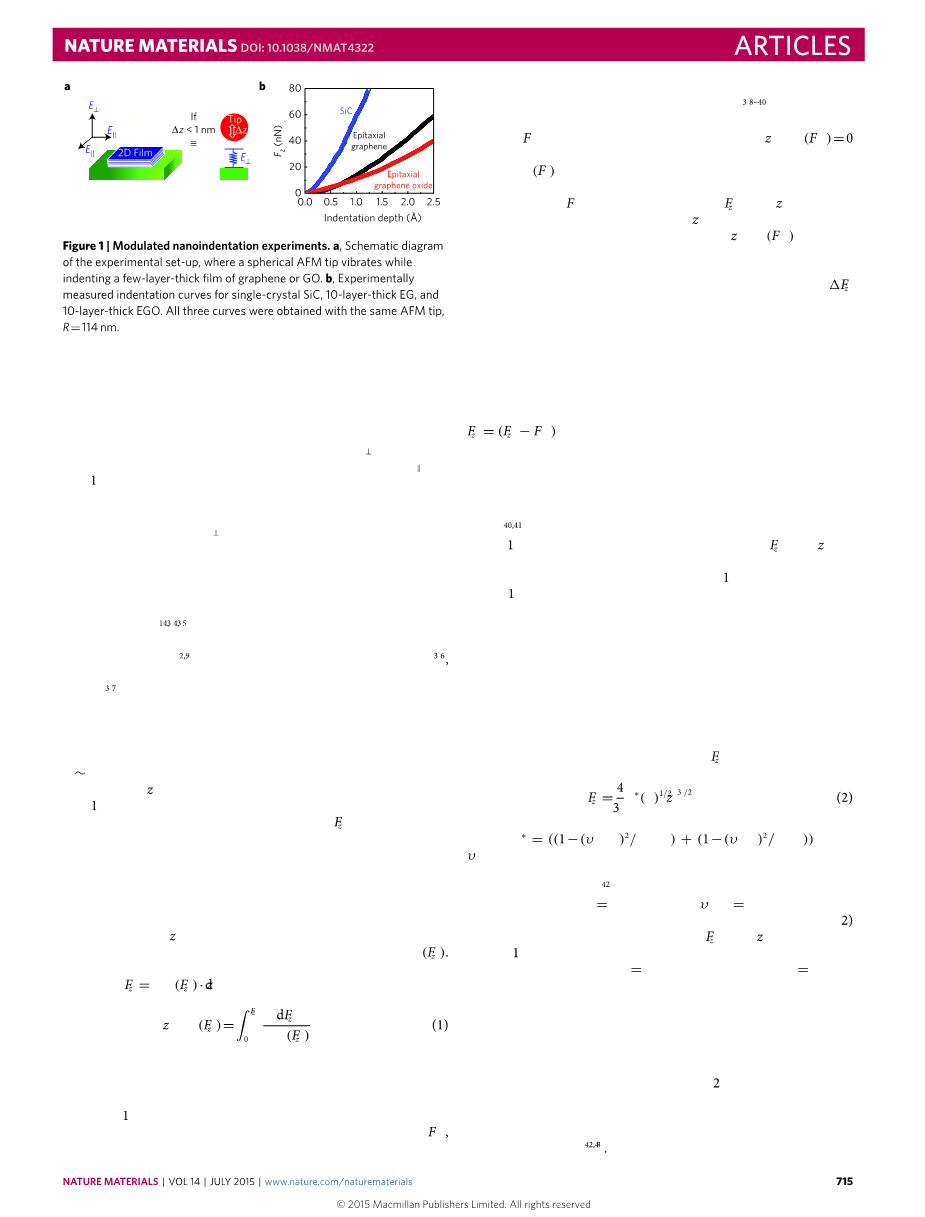 引言:二维材料,如石墨和二硫化钼,都是在平面的弹性已被广泛研究,在弯曲实验中,一个悬浮膜变形基本上;薄膜的几个原子层的厚度与强大的面内和弱相互作用层。然而,鲜为人知的是,膜的弹性模量垂直于平面,作为支持的二维膜9的平面弹性的测量需要压痕深度小于膜的层间距离。在这里,我们报告亚埃分辨压痕10测量垂直于二维的平面弹性材料我们的压痕数据,结合半解析模型和密度泛函理论11,12,然后用于研究几层厚的石墨烯和氧化石墨烯薄膜的垂直弹性我们发现氧化石墨烯薄膜垂直杨氏模量达到最大值时,一个完整的水层插层石墨平面之间。这种非破坏性的方法可以映射层间耦合和插在二维薄膜。